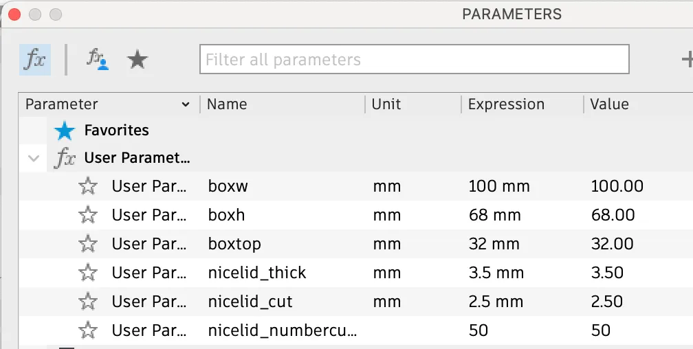 Như trong thiết kế đã liên kết, cái này cũng là tham số. Tôi đã chuẩn bị một vài kích thước định sẵn nhưng hãy thoải mái chuẩn bị một cái phù hợp với nhu cầu của bạn với những tham số này trong Fusion360: