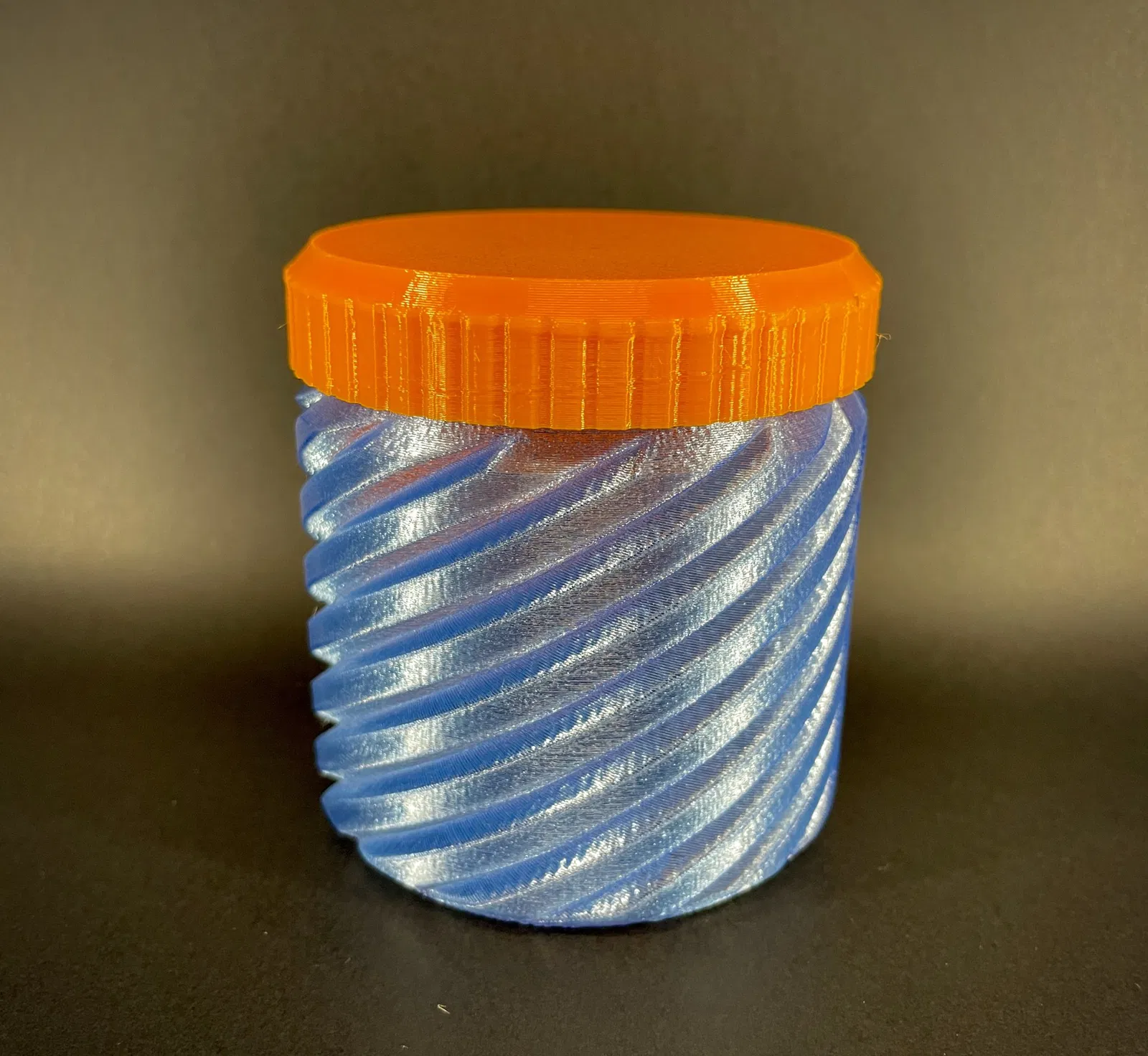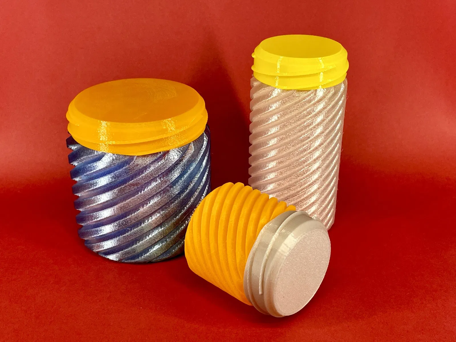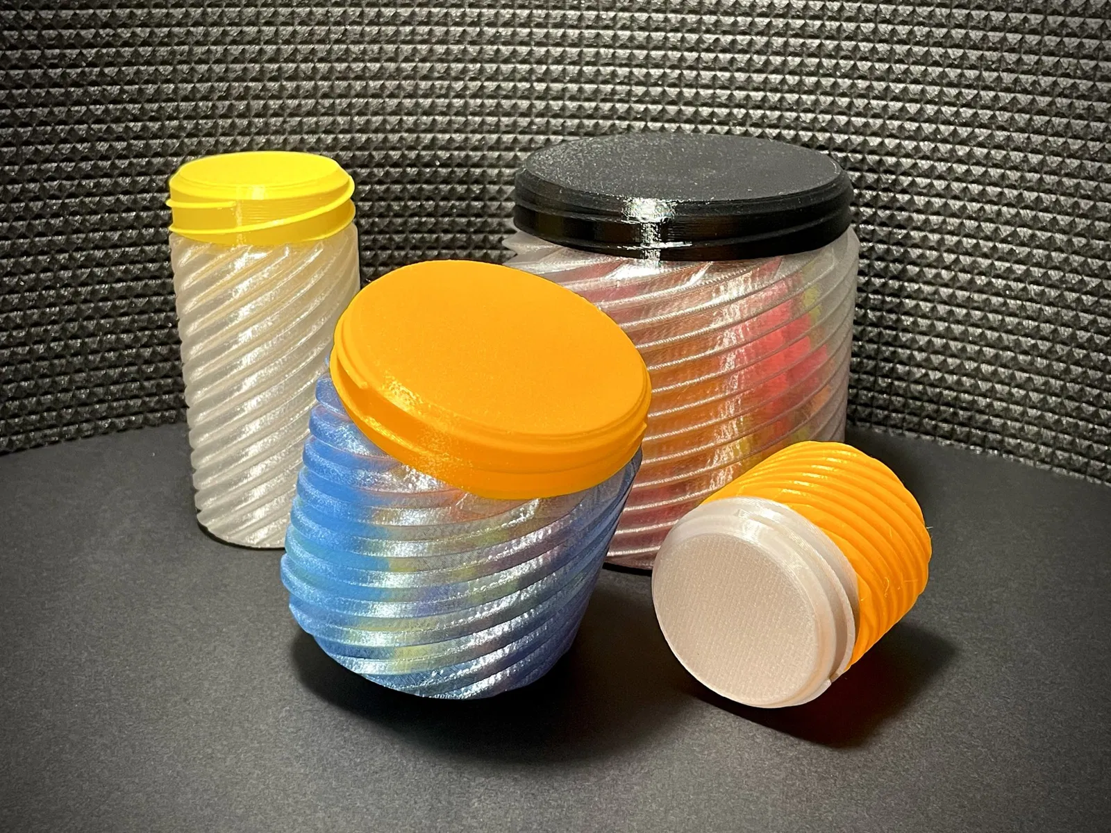 Tôi cung cấp cho bạn một bình/container tham số. Lần này là mô hình tròn có kết cấu. Nó có một nắp có ren - cả hai đều được in ở chế độ bình. Mô hình này nhanh chóng để in và yêu cầu rất ít vật liệu - phiên bản 100x100x100mm chỉ nặng 45g cho cả bình và nắp.