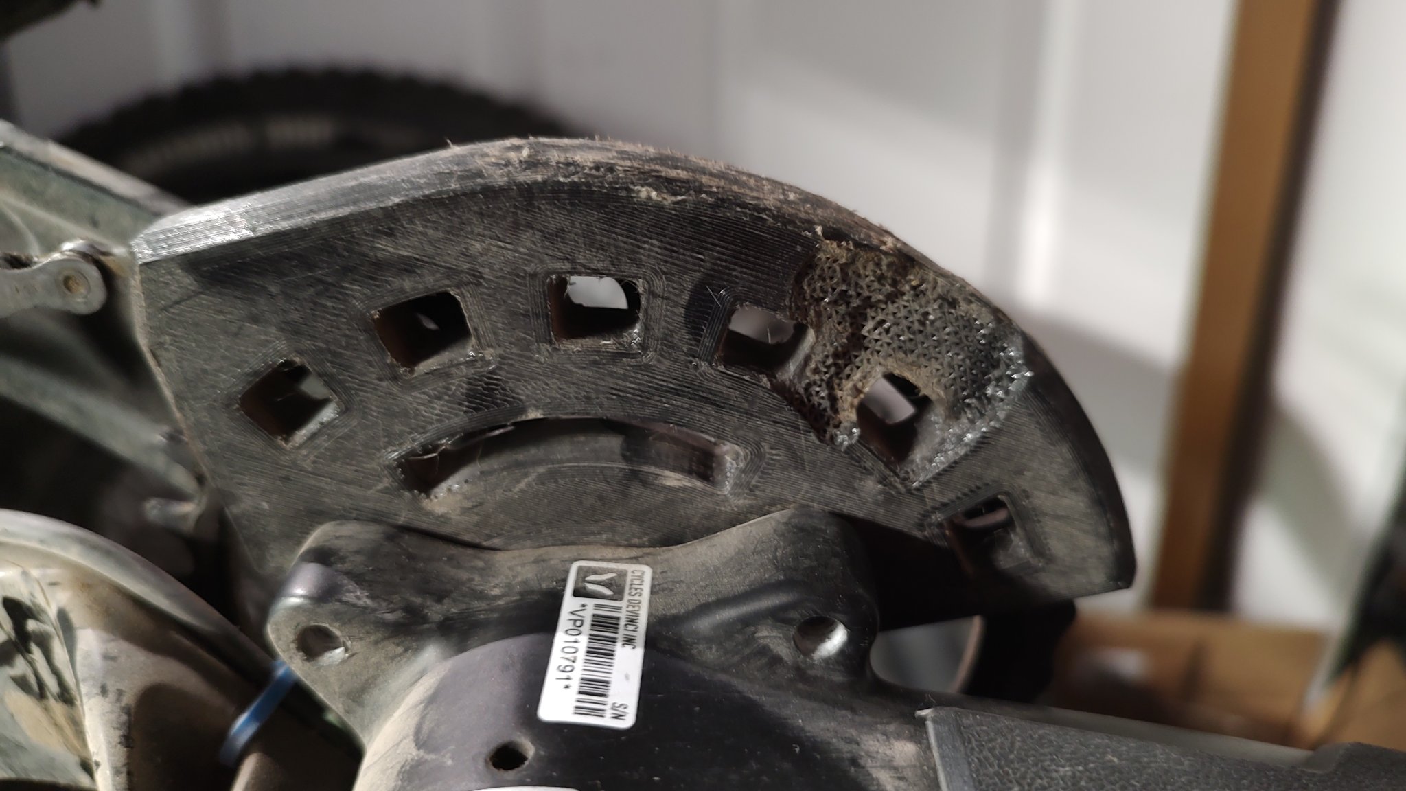 Bạn sẽ thấy rằng cái được chụp trong hình đã bị vỡ từ một cú nhảy cao 5' trực tiếp hạ cánh lên một khúc gỗ ở mép của cú nhảy tiếp theo… Dù sao đi nữa, cái bảo vệ đã làm tốt nhiệm vụ của nó và đĩa xích vẫn trong tình trạng hoàn hảo.