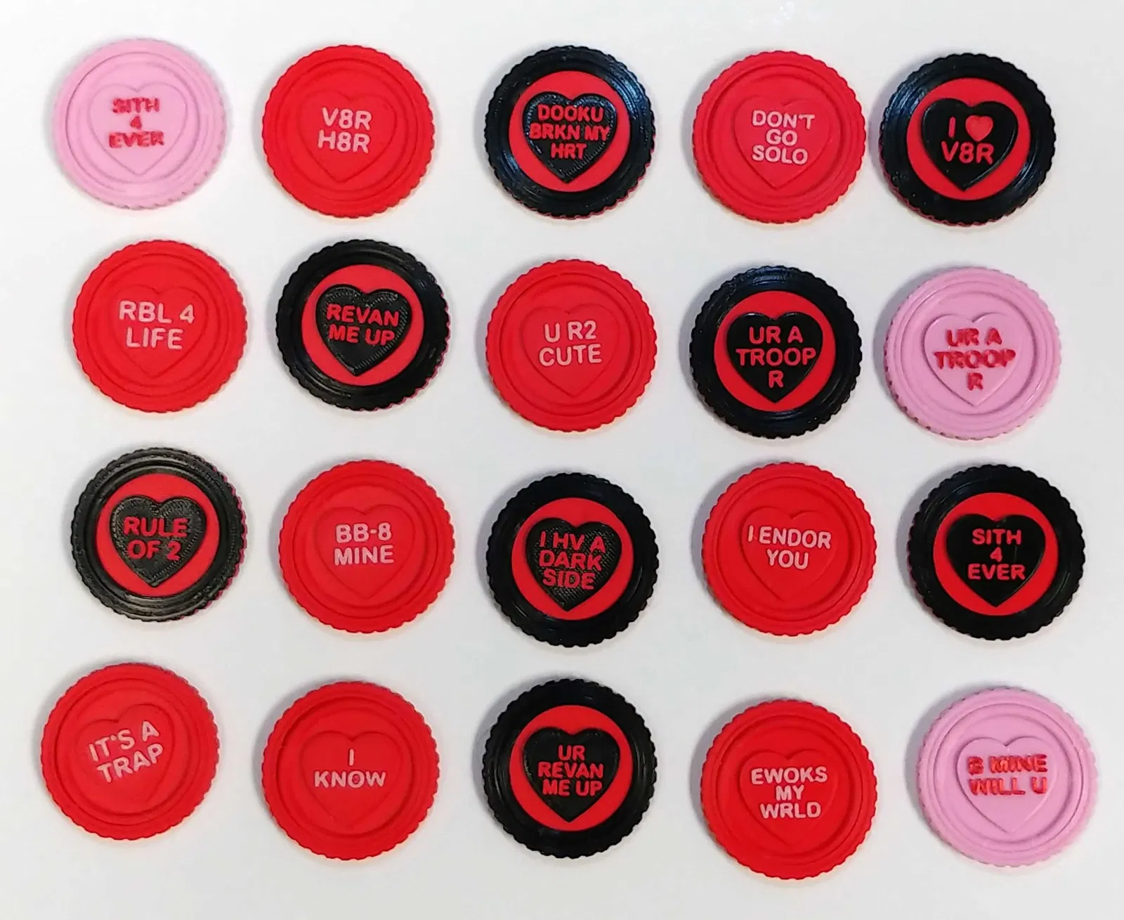 Chủ đề Star Wars Ngày Lễ Tình Nhân Trái Tim Trò Chuyện. Được hình thành trong buổi phát trực tiếp hàng đêm của Chris Pirillo trên Twitch (6 giờ chiều Giờ Thái Bình Dương) bởi Chris và cuộc trò chuyện. Những "đồng xu" fidget hình trái tim này chứa các câu nói theo chủ đề Star Wars ở mặt trước và các biểu tượng Star Wars tương ứng ở mặt sau. Chúng cũng được in thành các đồ chơi fidget xoay tại chỗ để tăng thêm sự thú vị. Chúng là món quà Ngày Lễ Tình Nhân hoàn hảo cho người yêu Star Wars trong cuộc sống của bạn.
