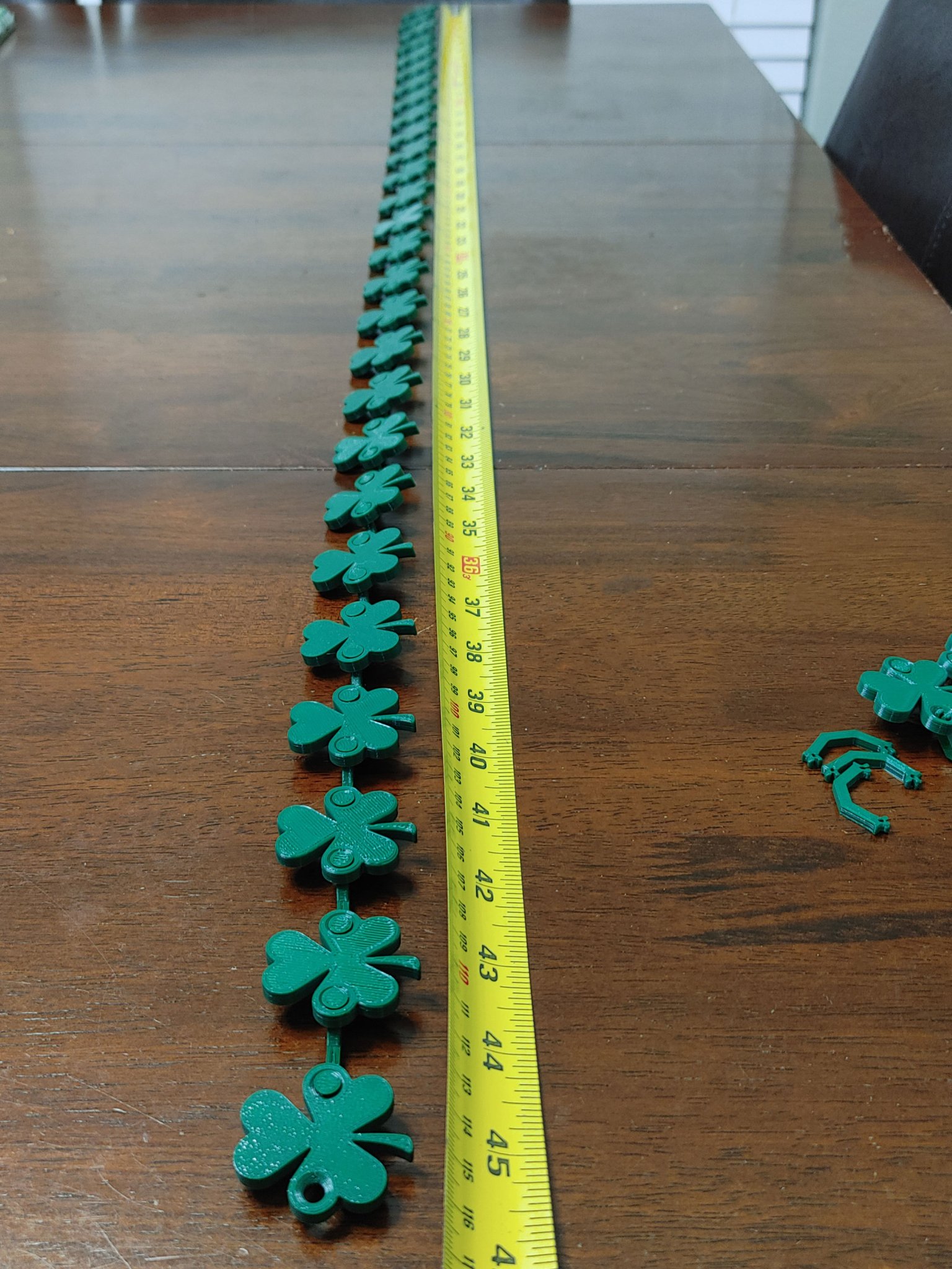Gần 4 ft chuỗi cỏ ba lá in tại chỗ từ phiên bản 27 cỏ ba lá. Các đầu nối được bao gồm để kết nối nhiều dây, hoặc để sửa chữa các liên kết không quay tự do. Các móc cũng được bao gồm để gắn vào các mảnh cuối cho các tùy chọn treo bổ sung.