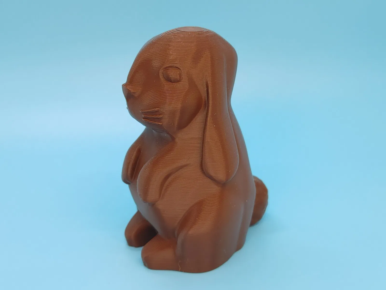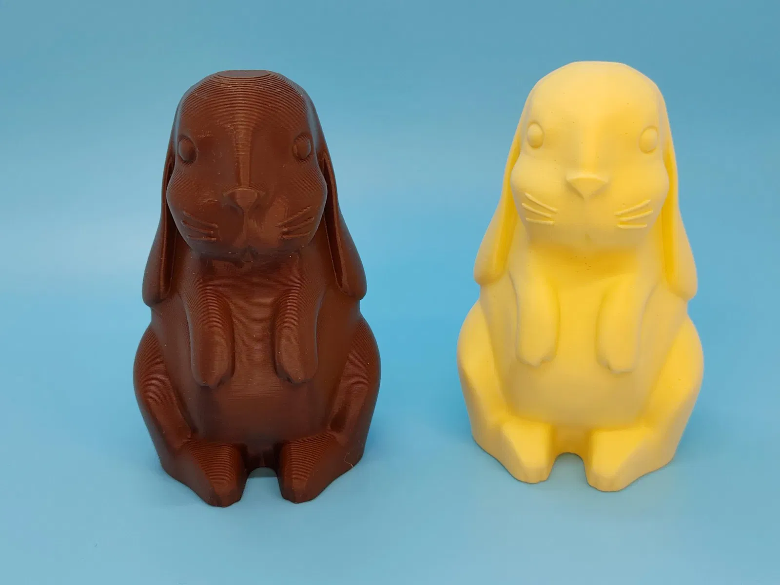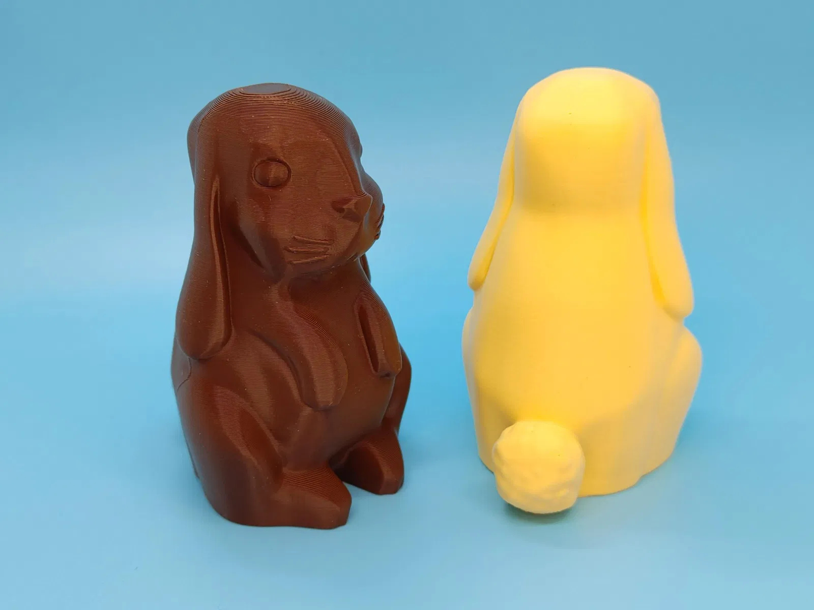 Mẫu được in mà không cần hỗ trợ ở độ cao lớp 0.2, với 3 viền & 15% độ đầy sáng. Được cắt bằng eSlicer 2.5.0 và in trên Prusa MINI+ (thỏ màu vàng) và Bambu Studio/in trên BambuLab x1-Carbon (thỏ màu nâu).