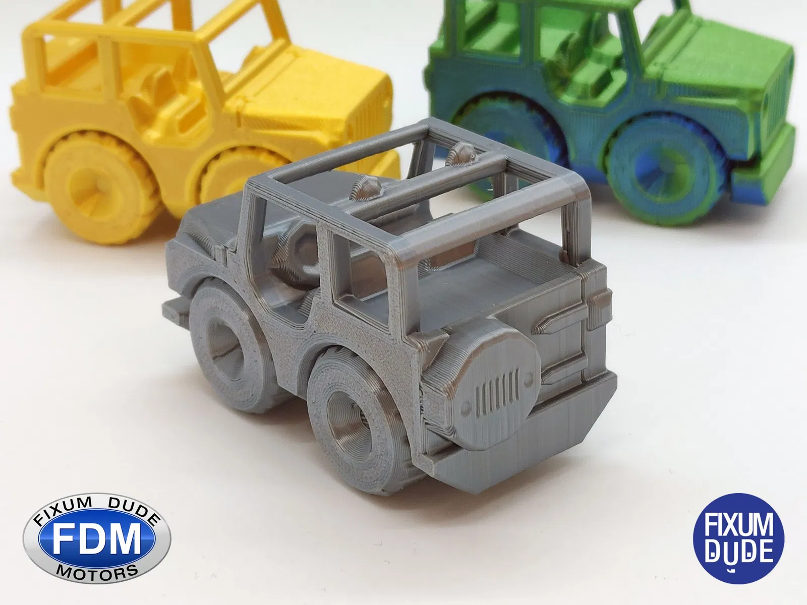 Giới thiệu về Jeep in place FDM (Fixum Dude Motors). Dựa trên mô hình sinh nhật K2_Kevin (https://www.f3d.vn/3d-model/43279-mo-hinh-xe-jeep-k2-kevin-chuc-mung-sinh-nhat-2023_kevin-birthday-model-2023). Tìm toàn bộ Bộ sưu tập FDM của các phương tiện tại đây: <https://www.f3d.vn/profile/fixumdude In mà không cần hỗ trợ. Các mẫu được in bằng PLA với chiều cao lớp 0.2, ít nhất 3 viền, và 10%-15% độ đặc gyroid. Các ví dụ được in bằng PolyMaker Silk Chrome PLA, Eryone Dual Color Blue/Green Silk PLA và một loại PLA lụa vàng không xác định.
