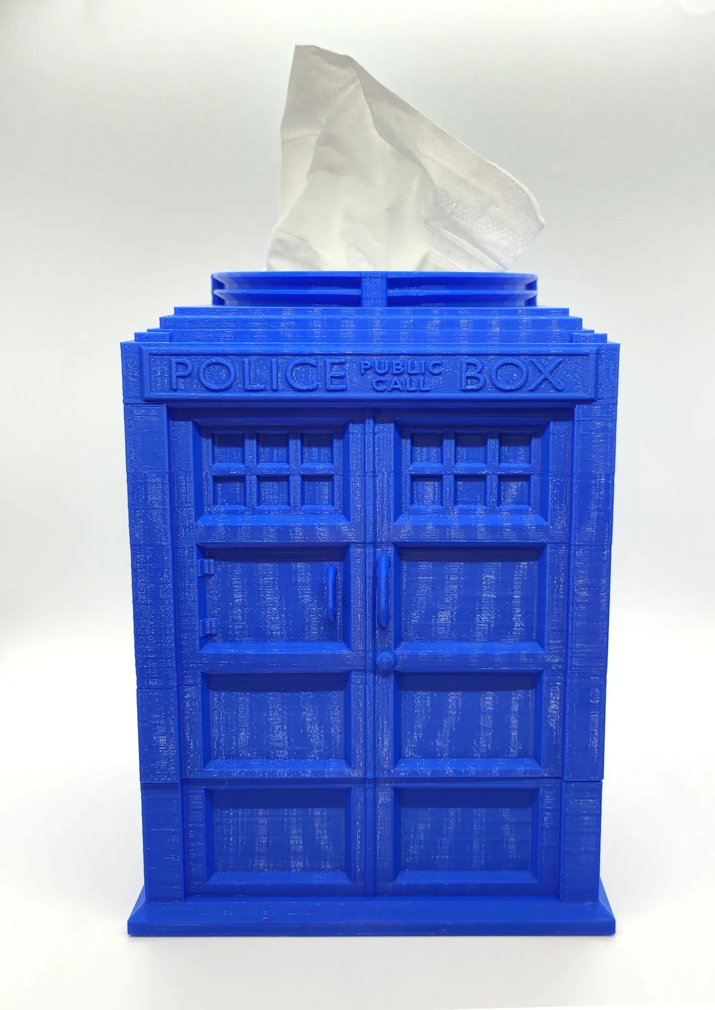 Bìa hộp khăn giấy lấy cảm hứng từ Tardis trong Doctor Who. Được thiết kế cho các hộp khăn giấy kích thước 4.5"x4.375"x5". Có một phiên bản hộp đơn với đế tùy chọn để tạo tỷ lệ tốt hơn.