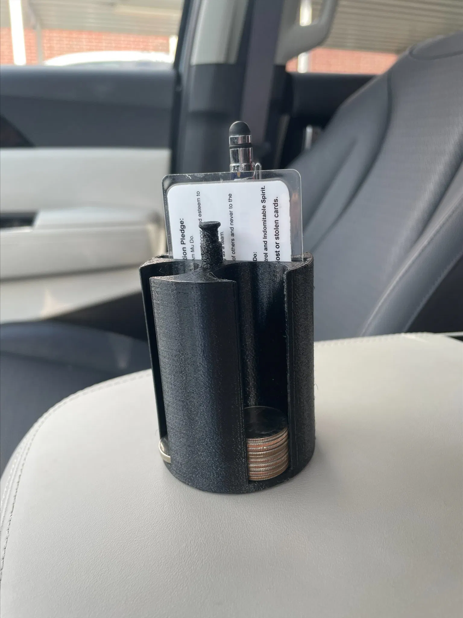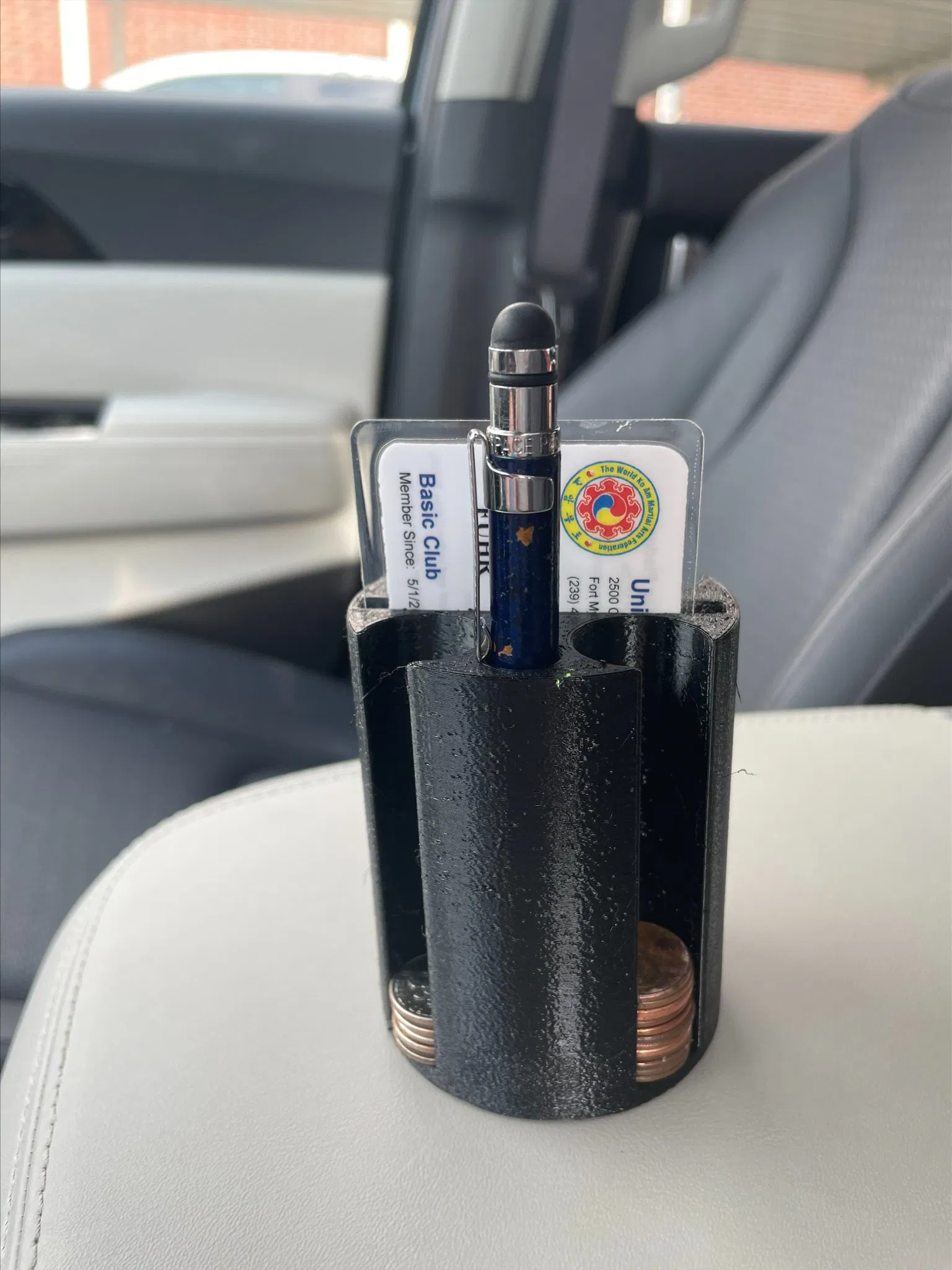 Tôi đã lắp ráp cái này trong Onshape. Tôi muốn một cái gì đó vừa vặn hoàn hảo trong khay đựng cốc của tôi, vì vậy kích thước cuối cùng là khoảng 65mmx80mm. Nó có chức năng phân loại tiền xu của Mỹ cho những thứ phiền phức khi có trong xe. Tôi đã sử dụng không gian thừa để đặt một giá đựng bút cho bút không gian của tôi và một khe có thể chứa thẻ tín dụng, thẻ ID hoặc sổ tay nhỏ. Cuối cùng, có một thanh nâng cao để có thể dễ dàng di chuyển xung quanh trong xe. Tôi đã in nó bằng PETG vì ở Florida rất nóng và tôi muốn cho nó cơ hội tốt nhất để tồn tại. In tốt với vòi phun lớn hơn và ở tốc độ hoặc chất lượng.