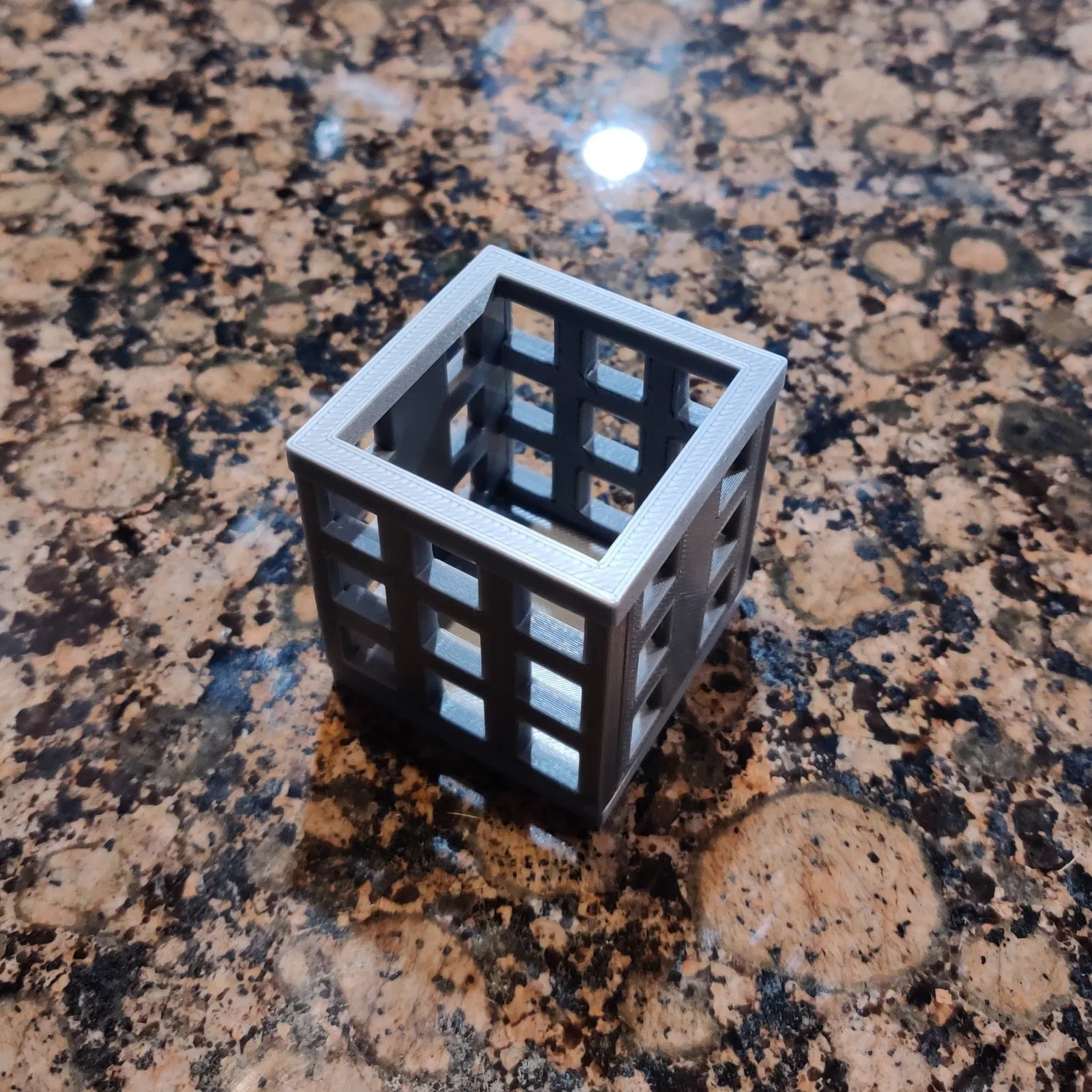 Hộp 50mm x 50mm x 51mm tôi đã in như một bài kiểm tra cho một hộp lớn hơn nhiều. Bản in thành từng mảnh, lắp ráp và keo cho sức mạnh