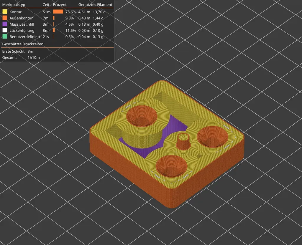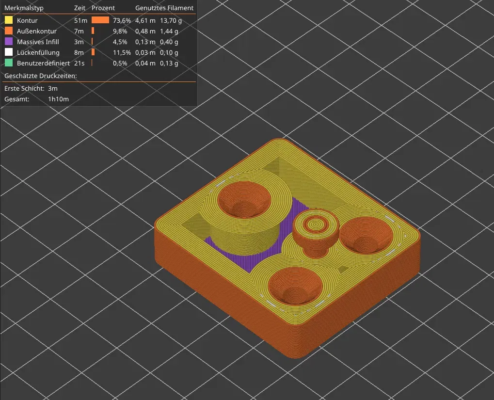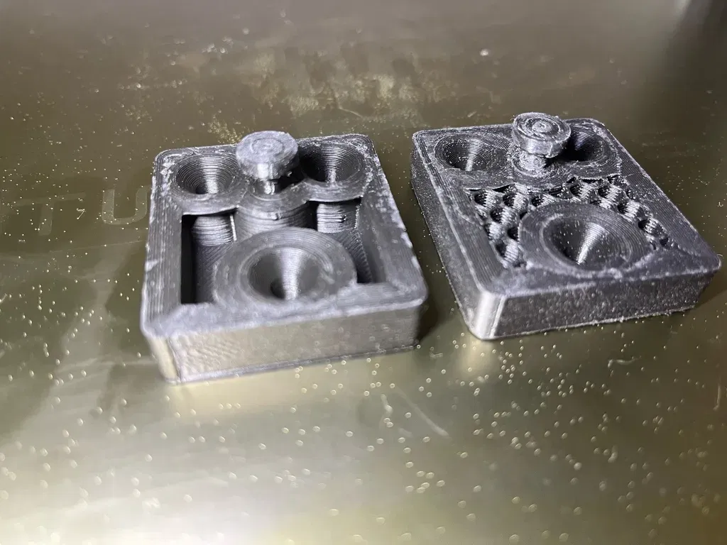 Các giá đỡ trắng là từ phiên bản đầu tiên và được in bằng PLA+. Những cái này không có thanh liên tục. Tôi đã sử dụng một giọt keo siêu dính, mà tôi để chạy quanh mép (Để yên tâm mà ngủ ;) ). Các bức ảnh với các giá đỡ màu đen được làm từ PLA đen mờ, vì tôi không còn PLA+ trắng để công bố.