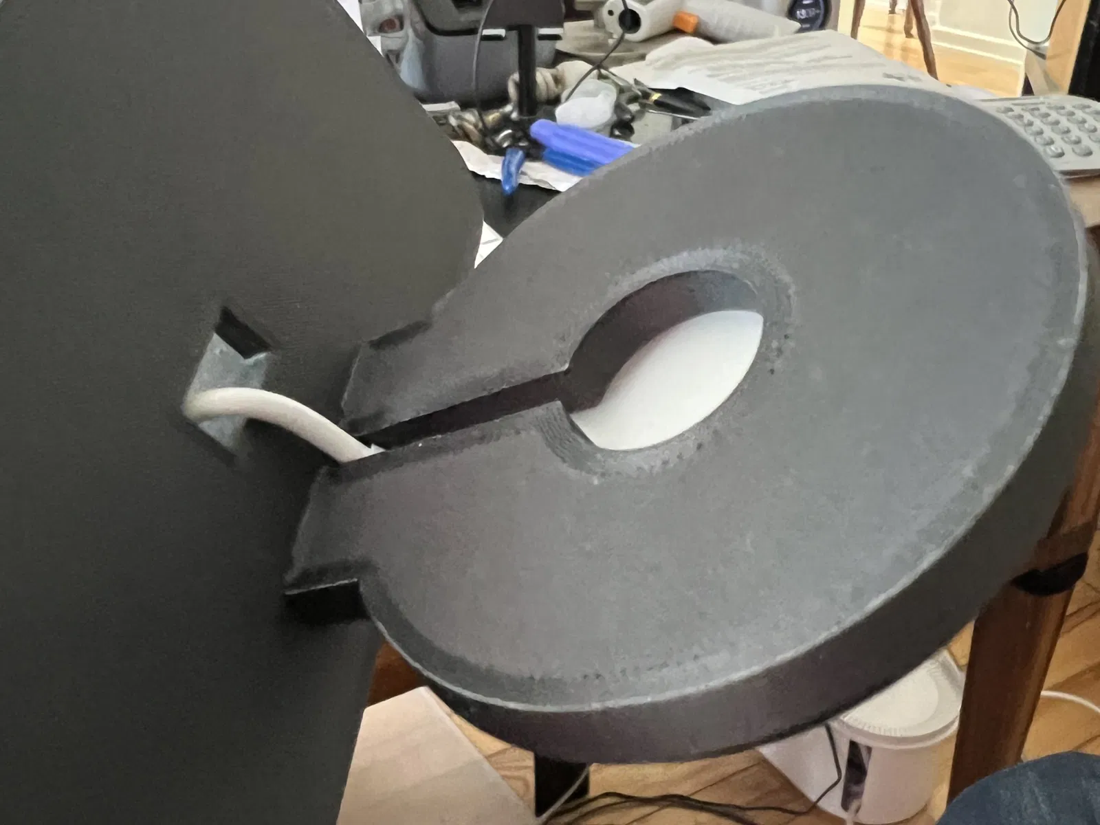 Bằng cách này, cả hai phần, chân đế và giá đỡ Magsafe có thể được kết nối hoàn hảo bằng hai vít đầu pan và không cần hỗ trợ cho việc in. Dây sạc sẽ biến mất dưới bảng điều khiển và có thể dẫn đến ổ cắm thuốc lá.