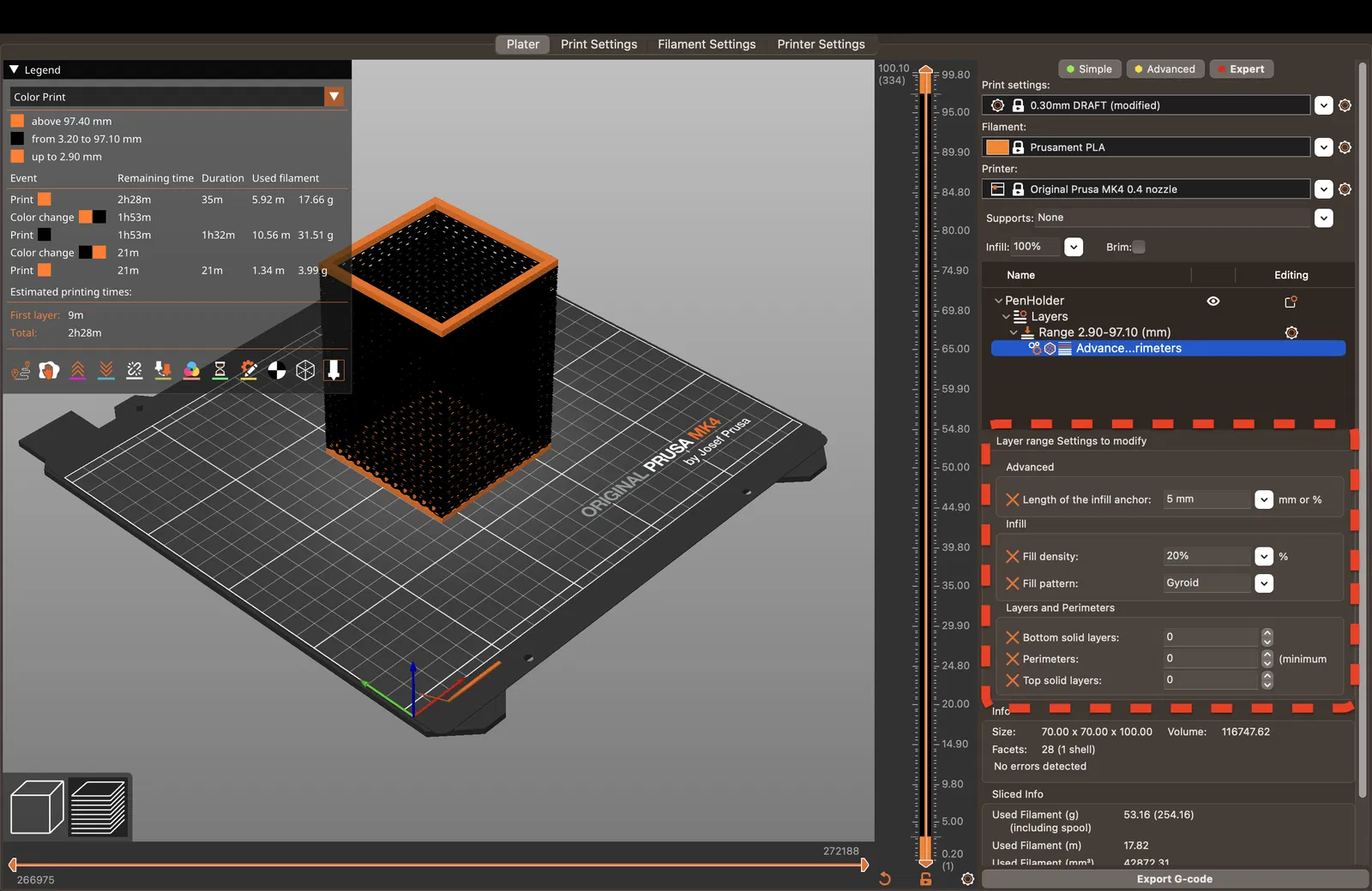 Cài đặt Slicer: * Trong file đính kèm có một bộ điều chỉnh chiều cao để thay đổi mật độ lưới in (infill) và đường viền (perimeter). Trong ví dụ của tôi, tôi đã dùng mật độ lưới Gyorid 20%. Bạn có thể thấy cài đặt tôi đã dùng trong ảnh chụp màn hình Slicer.