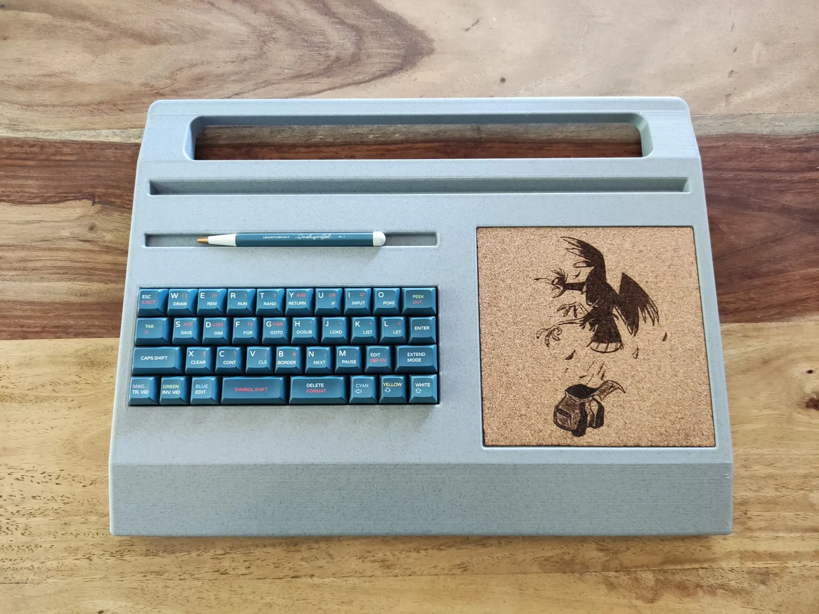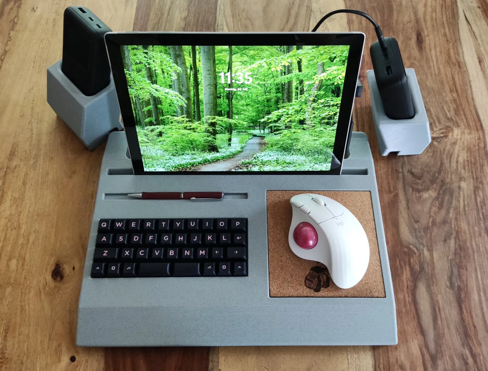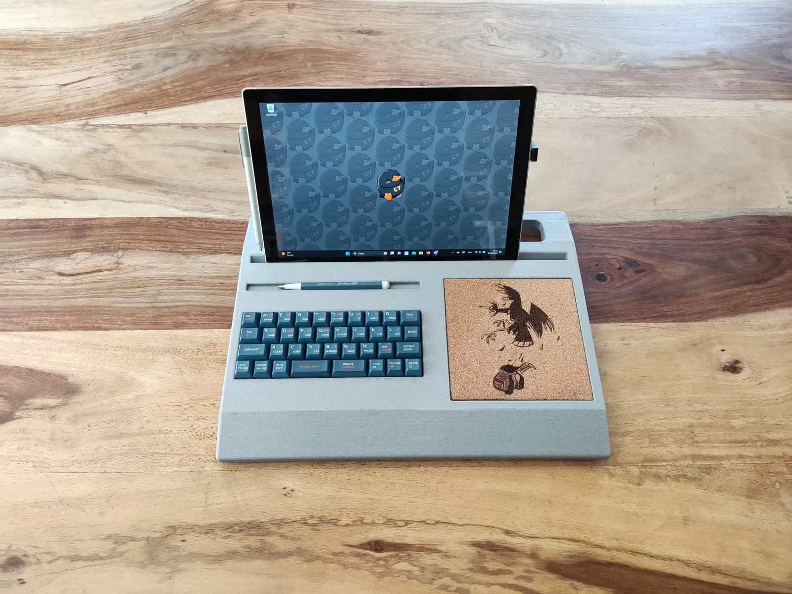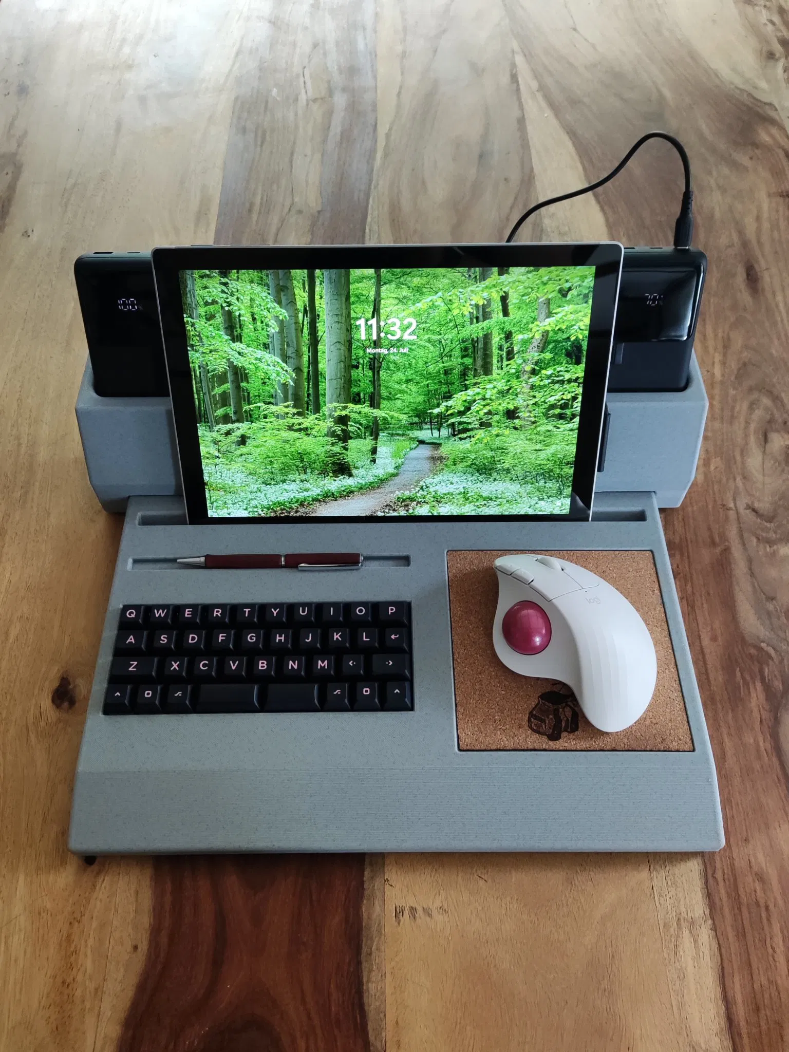 Đây là một vỏ bàn phím QAZ kết hợp với giá đỡ máy tính bảng, bàn di chuột và thanh bút để sử dụng như một cyberdeck mô-đun. Máy tính bảng của bạn phải dày tối đa 9mm để vừa. Đối với đầu nối usb, bạn phải hàn cáp usb dài khoảng 8cm với 2 ổ cắm (https://aliexpress.com/item/1005005461853645.html và https://aliexpress.com/item/1005005334574996.html (đực). PCB được lắp đặt trên khay bằng 3 vít tự cắt 6mm.