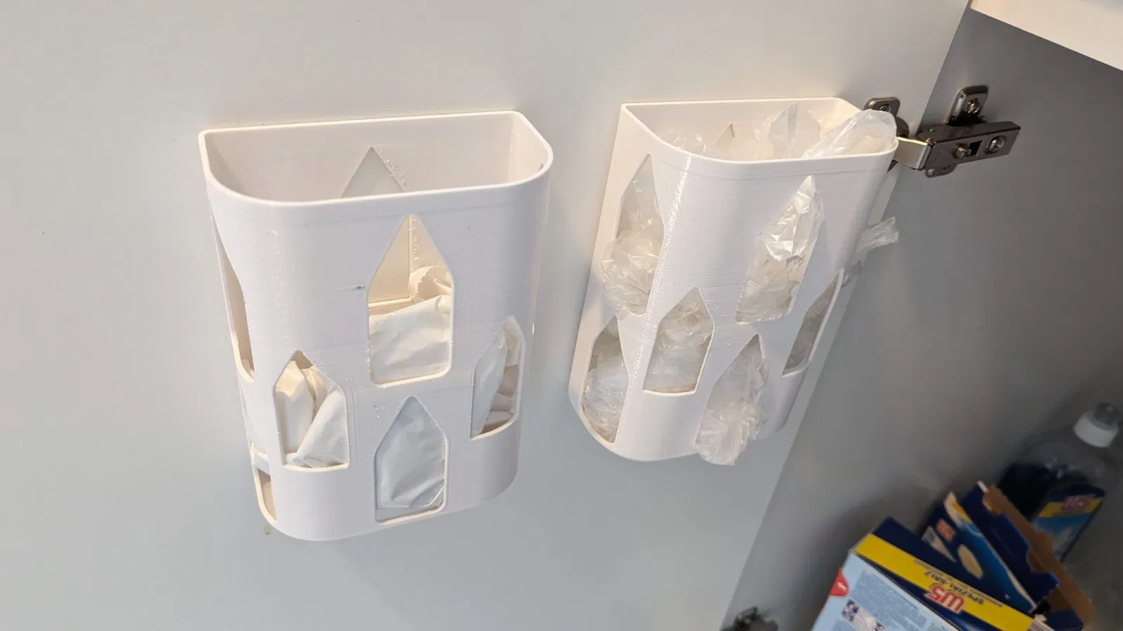 Một giá đỡ túi nhựa cho những túi nhựa nhỏ mà bạn thu thập theo thời gian. Túi có thể được kéo ra từ bất kỳ bên nào. Bạn có thể dán nó lên tường bằng một số băng dính.