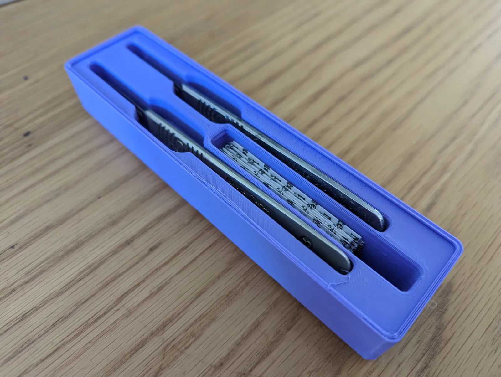 Mô hình này chứa được tối đa hai con dao phẫu thuật Swann Morton (hoặc tương tự), và có không gian cho việc lưu trữ lưỡi dao bổ sung. Mỗi ngăn đều có một chốt, vì vậy bạn có thể ấn xuống phần đuôi của con dao phẫu thuật, nâng phần đầu lên để dễ dàng tiếp cận hơn.