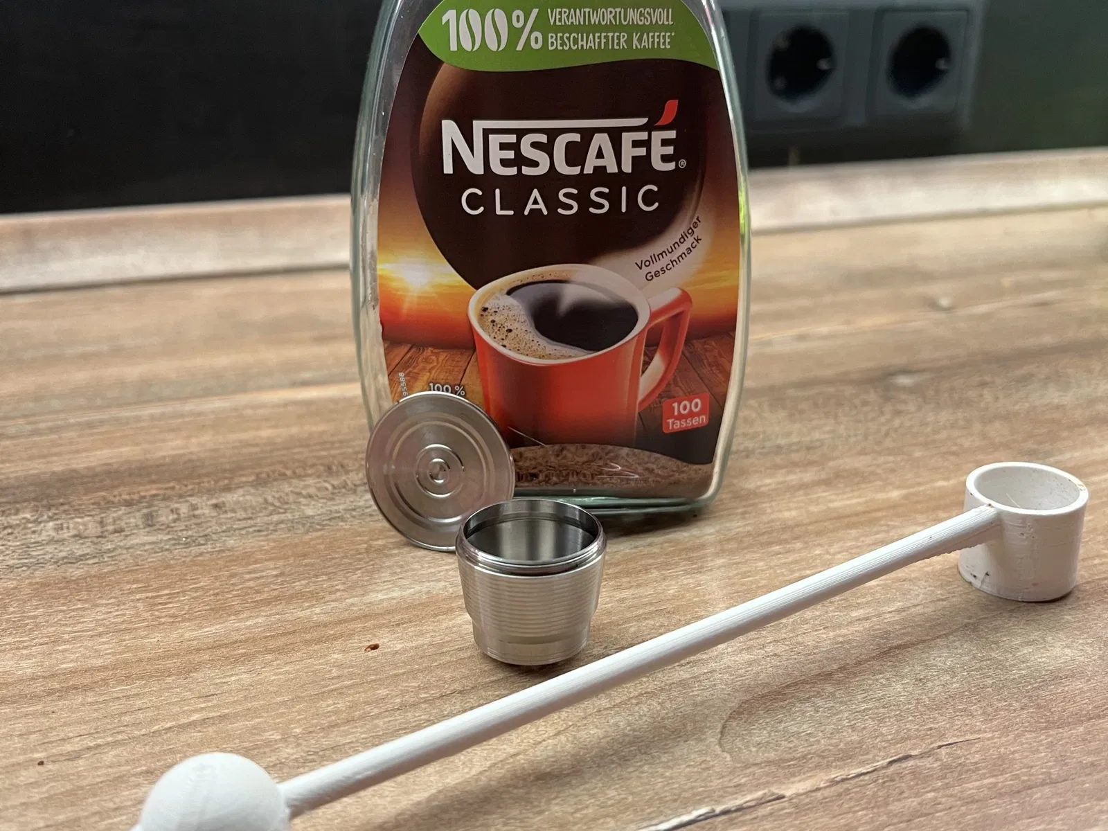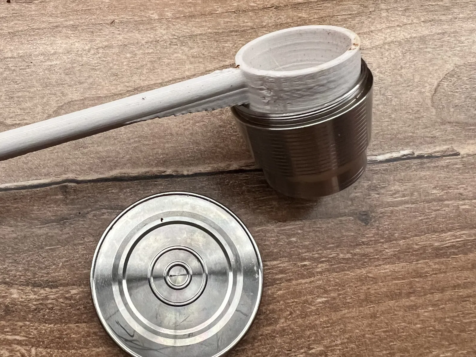 Kelle um in dem Glas ganz unten an das Pulver zu gelangen und Tamper fuer Nespresso Caps
