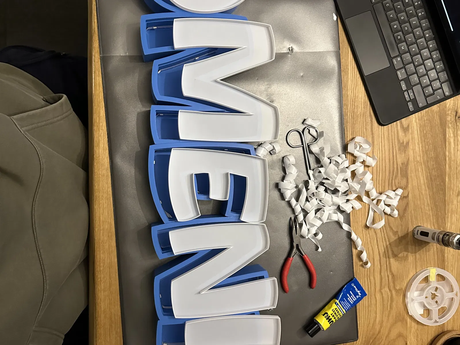 Domenik như một đèn tên LED có thể in. In từng chữ cái riêng lẻ, để dán các bản nháp cáp