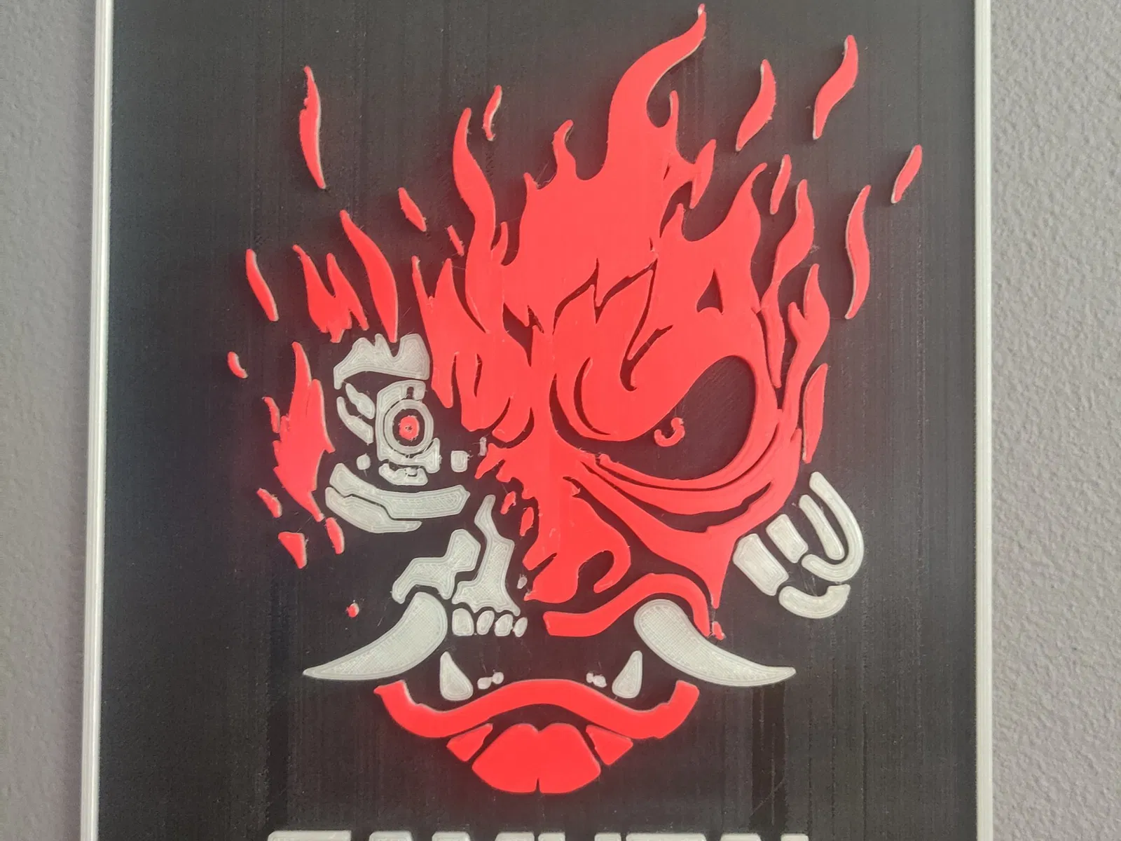 Một logo samurai cyberpunk tấm tường 140x165. In bằng vòi phun 0.4mm với kỹ thuật là phẳng. Cần hai lần thay đổi màu sắc, sử dụng filament PLA phát quang cho lần thay đổi màu đầu tiên. Dựa trên điều này.