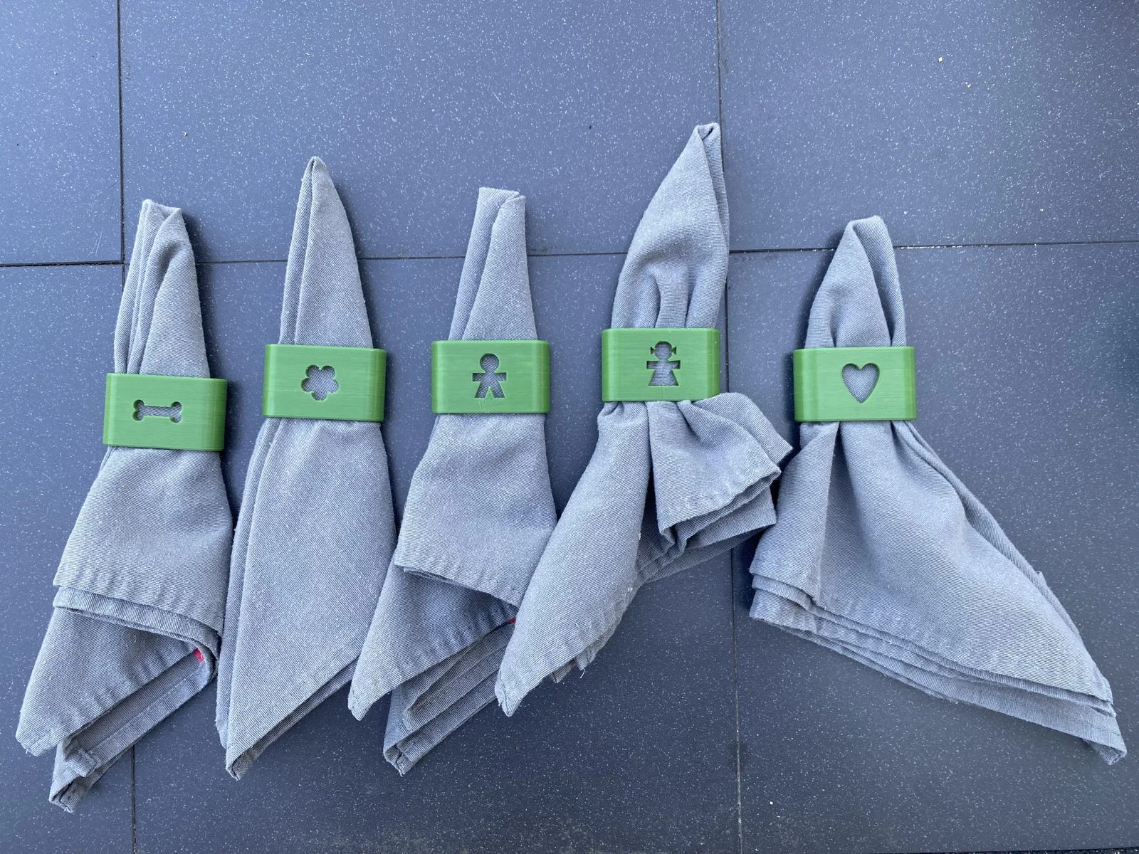 Sáu giá đỡ khác nhau để giữ khăn ăn lại với nhau và/hoặc xác định khăn ăn của riêng bạn nếu bạn muốn tái sử dụng nó. Khăn ăn trong ảnh có thể tái sử dụng kích thước 30x30 cm. Nếu không có khăn ăn, chúng khá cồng kềnh nhưng không đáng chú ý khi kết hợp với khăn ăn. Chỉ có một cái không được hiển thị trong ảnh là con mèo, hãy kiểm tra tệp đó!