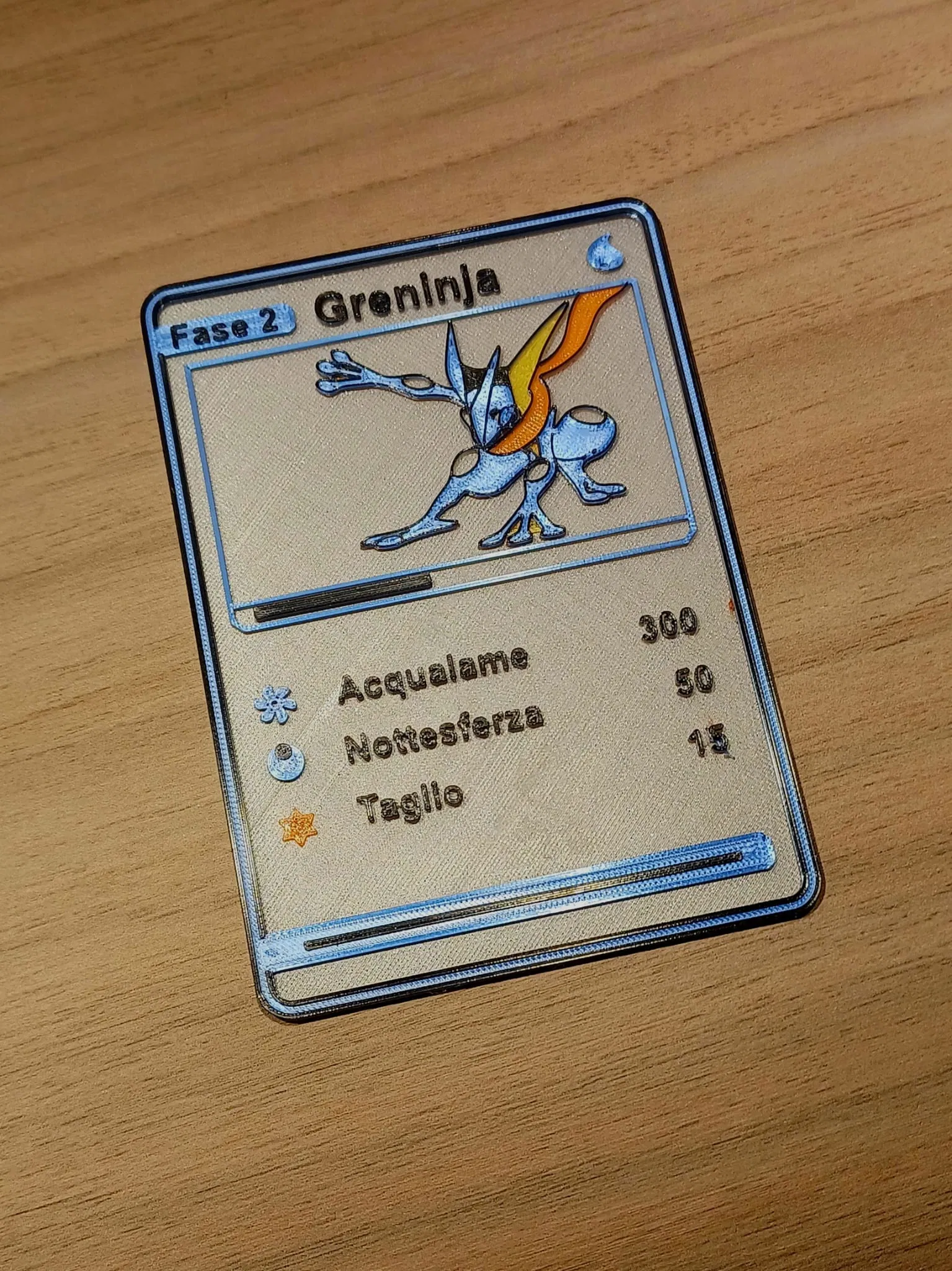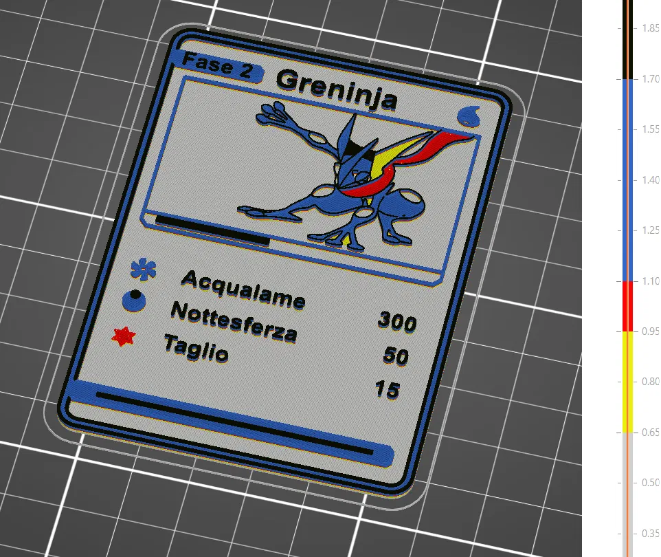 Mô hình thẻ Pokemon Greninja phiên bản Tiếng Ý, được in 3D với khả năng đổi màu thủ công bằng Prusa Slicer. Độ dày 2mm, in với nozzle 0.25mm.