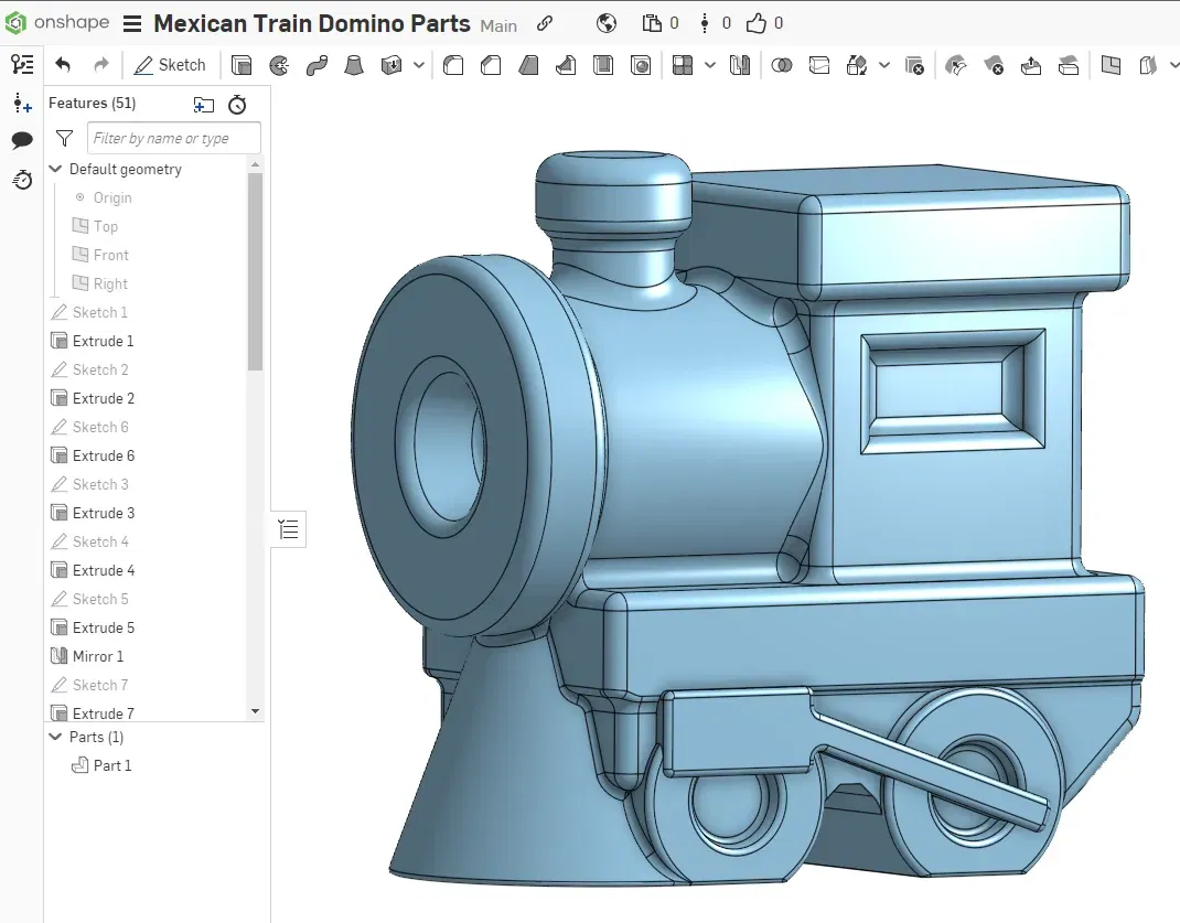 Một đồng nghiệp đã đề cập rằng anh ấy có một số mảnh bị hỏng và mất trong bộ domino Mexican Train của mình. Anh ấy đã hỏi liệu tôi có thể in cho anh ấy những mảnh thay thế và thêm một chút đường ray xung quanh tâm không. Hy vọng rằng nếu bạn có một trong những bộ này và có mảnh bị hỏng hoặc bị thiếu… điều này có thể giúp bạn hoạt động trở lại. Các hình xe lửa có thể khó in với đầu phun 0. 4mm. Hãy in chậm, và tôi khuyên bạn nên sử dụng một lớp đế nếu bạn thường gặp vấn đề về độ bám dính của giường in. Ngoài ra, in nhiều hơn một cái cùng lúc có thể giúp làm mát. Tôi đã bao gồm các tệp STL, tệp Step, và các liên kết bên dưới đến các tệp Onshape gốc. Liên kết Onshape: