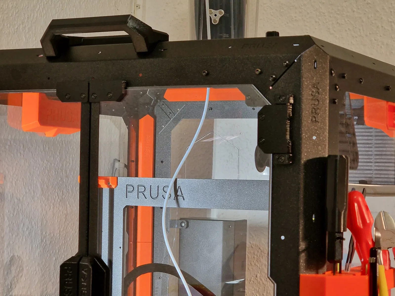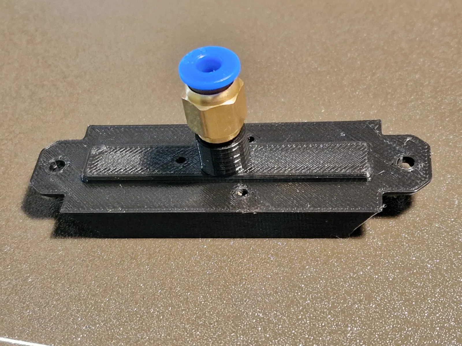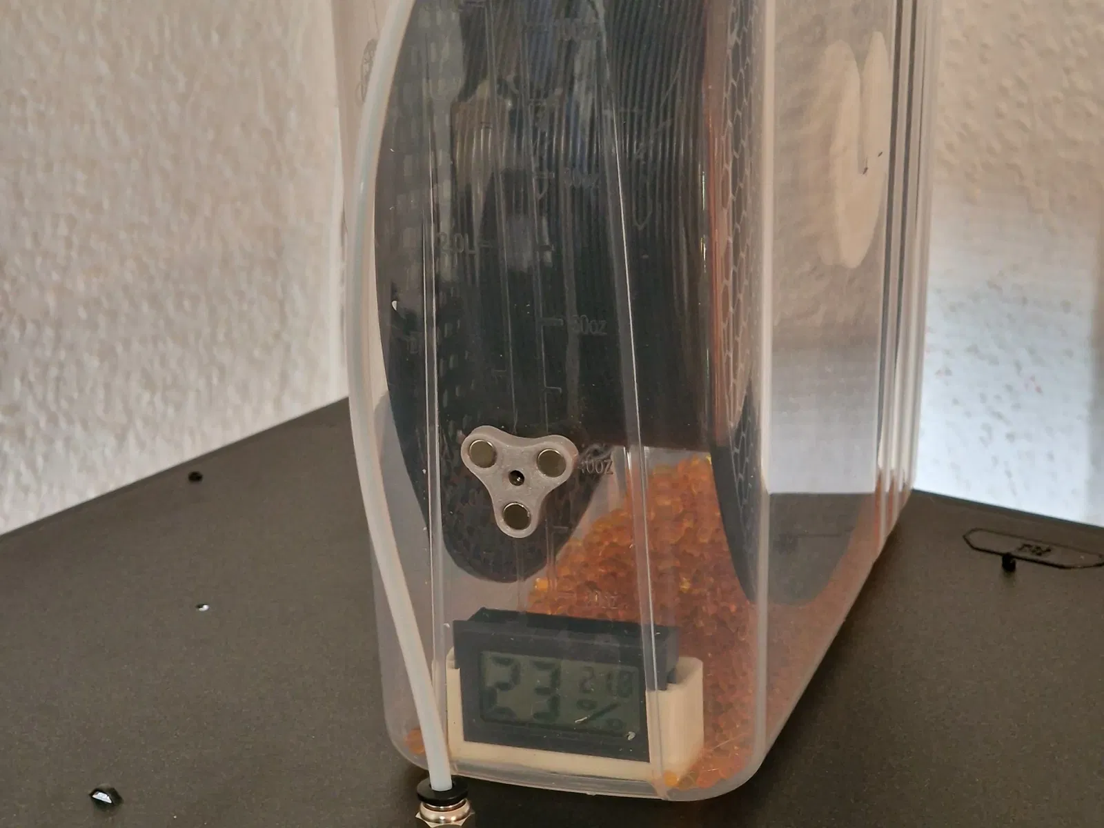 Tôi muốn đảm bảo một đường dẫn hoàn toàn kín từ Drybox của tôi vào Enclosure và đến Máy in. Để dễ dàng mở bowden mà không cần nỗ lực, tôi đã quyết định sử dụng giải pháp , một bộ nối từ tính được thiết kế tốt, mà tôi đã kết hợp với nắp trung tâm trên cùng của enclosure. Từ bên trong chỉ có thể sử dụng một đầu nối PC4-M6, một kết nối M10 sẽ quá rộng để chèn từ trên xuống. Các nam châm tròn 6x3mm vừa vặn và nên ở lại bên trong ngay cả khi không có keo, tôi sử dụng biến thể N52 của Nam châm Neodyme, đó là loại mạnh nhất mà bạn có thể có, và các nam châm vẫn kiên cường ở lại trong các lỗ. Đối với việc in, tôi đã kích hoạt hỗ trợ nhưng đã giảm góc cho hỗ trợ tự động xuống 40%, vì vậy hỗ trợ sẽ chỉ nằm dưới cả hai đầu và không ở trong các lỗ nam châm. Bạn phải đặt mặt nam châm lên bàn in để cắt, tệp STL nên được định hướng tương ứng.