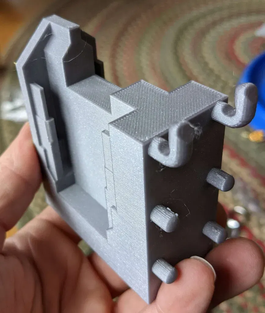 - móc giờ đây ngắn hơn một chút; mô hình cũ hơi lỏng lẻo so với bảng ghim, vì vậy khoảng cách dự kiến giờ đây giảm 1mm (xuống còn 5mm), phù hợp với những gì thước kẹp của tôi cho biết là độ dày của bảng ghim ¼" của tôi.