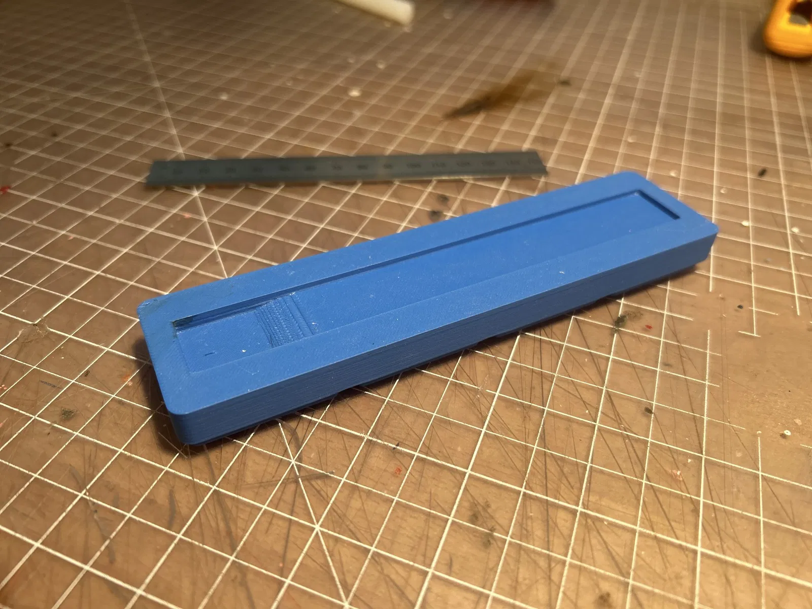 Giá đỡ Gridfinity cho thước thép Mitotoyo 150 mm. Nó có một phần lõm, vì vậy nếu bạn nhấn vào đáy, nó sẽ lật lên và bạn có thể lấy nó.
