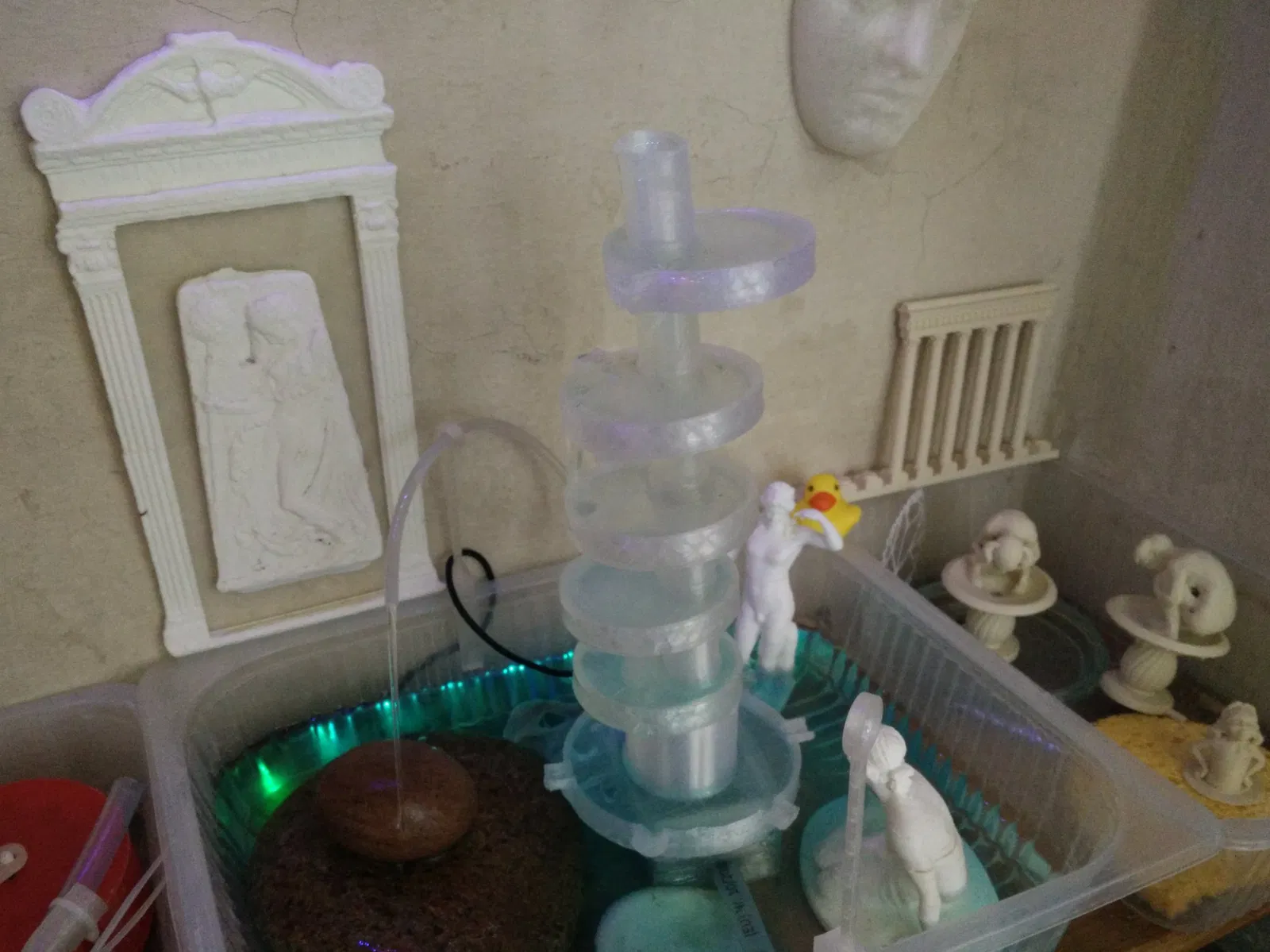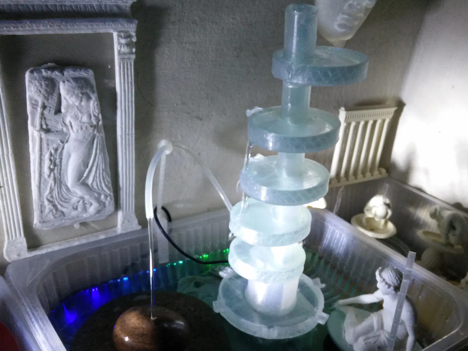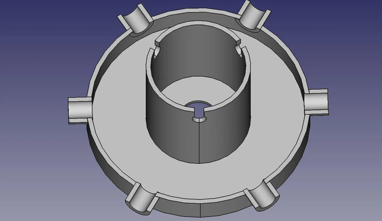 Đây là một phần của một dự án tạo ra một đài phun nước cho ban công hoặc trong nhà. Mô-đun bao gồm một bồn tròn với một cột thẳng đứng lệch tâm phù hợp với lỗ của một phần tử tương tự khác. In bằng TPU, kết nối này ổn định và gần như kín nước, vì vậy có thể cắm một ống (đường kính ngoài 11mm) từ dưới vào các cột kết hợp và nước sẽ chảy lên bên trong và cuối cùng tràn ra ở phía trên. Bồn có một lỗ khác ở bên hông nơi nước có thể chảy ra một cách có kiểm soát đến bồn bên dưới, với điều kiện là không có quá nhiều nước chảy và đài phun đứng thẳng và dọc. Có một khoảng trống khoảng ~27mm giữa sàn của một mô-đun đến mức nước của bồn bên dưới nơi nước nhỏ giọt sẽ rơi xuống và không phát ra âm thanh lớn. Ý tưởng là tạo ra một đài phun nước có thể nghe thấy âm thanh của nước róc rách nhưng theo cách yên tĩnh và nền tảng để bạn có thể gần như quên nó và thư giãn. Ở dưới cùng là một phiên bản đã được sửa đổi, bồn lớn hơn, có 6 miệng tràn và có một cột rộng cao 45mm ở giữa để giúp các mô-đun phía trên đứng thẳng. Cột rộng có 3 lối ra nơi một ống nhỏ với đường kính ngoài 6mm có thể được cố định và nó không có một cột nhỏ để đi vào đáy của mô-đun phía trên, thay vào đó, ống 11mm (bên ngoài) phải giữ mọi thứ lại với nhau. Lý do cho điều này là ống nước có một T ở đây để tách hai dòng nước từ lối ra của bơm và giảm lưu lượng nước cho đài phun. Cũng có sự khác biệt cho mô-đun ở trên cùng không cần phần cột mỏng hơn để cắm vào mô-đun tiếp theo. Không có mô hình cho điều này, chỉ cần tạm dừng/dừng in khi nó đạt đến phần đó. Tất cả những điều trên phụ thuộc vào ở dưới để cung cấp nước và hỗ trợ cho đài phun.
