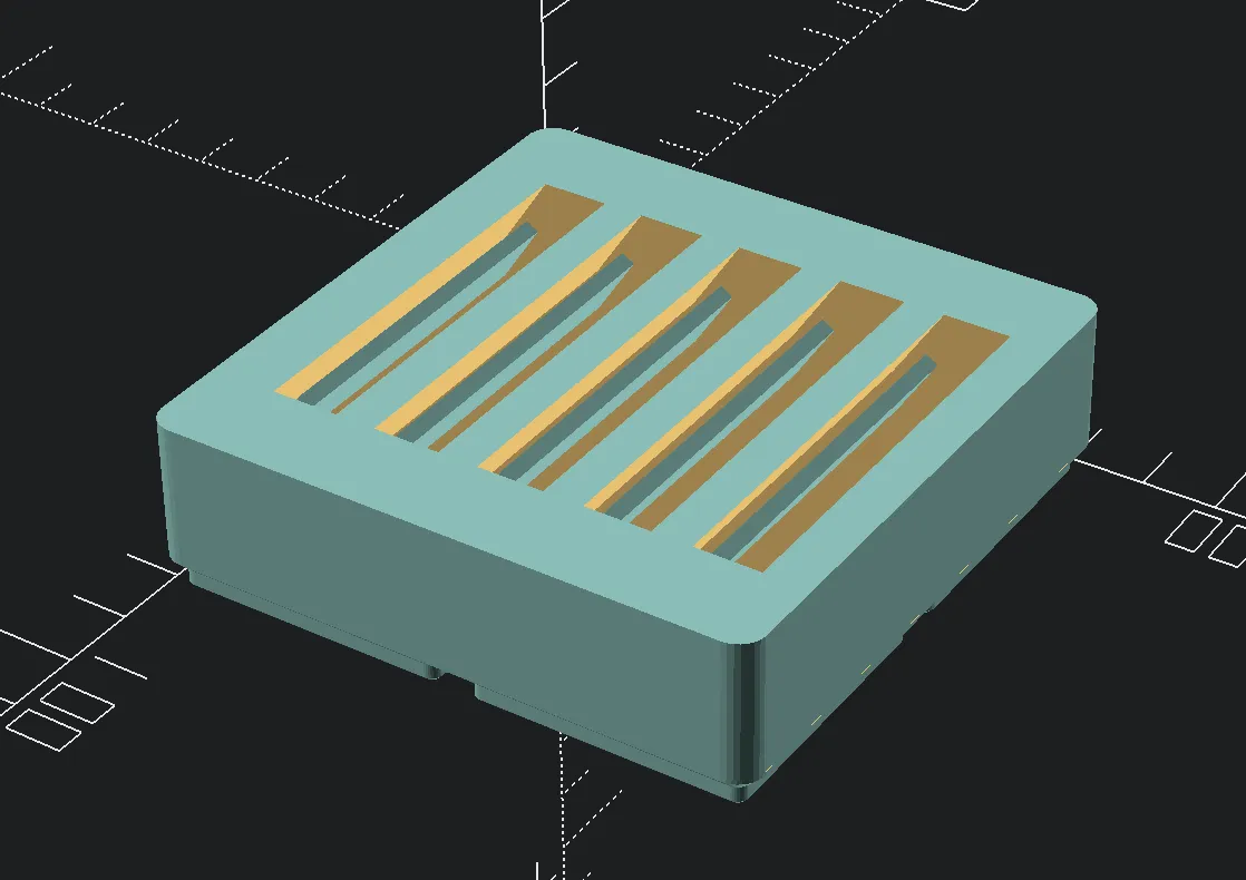 GBA Gridfinity Một biến thể có thể tùy chỉnh nhẹ của thiết kế thùng chứa đơn giản của @KyleWarren để bạn có thể lưu trữ/trưng bày các cartridge GameBoy của mình. Tôi đã sử dụng nó để giữ cho các trò chơi GBA của mình được tổ chức trong ngăn kéo bàn nông, nhưng thiết kế khe này cũng hoạt động cho các trò chơi gameboy và gameboy color, tất nhiên. Có một “chốt đăng ký” kiểu như vậy để đảm bảo rằng bạn đặt các cartridge với nhãn hướng lên trên. Điều này có thể được loại bỏ trong mô hình tham số bằng cách đặt tất cả các kích thước của nó thành 0. Nếu bạn dự định sửa đổi điều này bằng cách sử dụng mô hình OpenSCAD, hãy chắc chắn tải xuống tệp stl thích hợp tại đây. Cấu hình mặc định sử dụng thùng 2x2x3. Đặt tên tệp là “gridfinity.stl” và giữ nó trong cùng thư mục với dự án openscad của bạn.