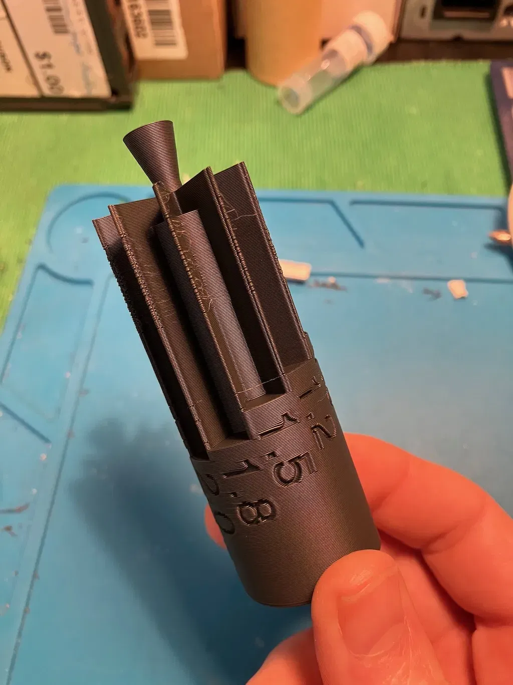 Tay cầm không mạnh lắm do hướng in. Nếu tay cầm bị gãy, bạn có thể vặn một con ốc M3 vào bộ chèn để tạo ra một tay cầm mạnh hơn. Hoặc bạn có thể không in tay cầm và cẩn thận sử dụng kìm để lấy bộ chèn ra nếu cần.