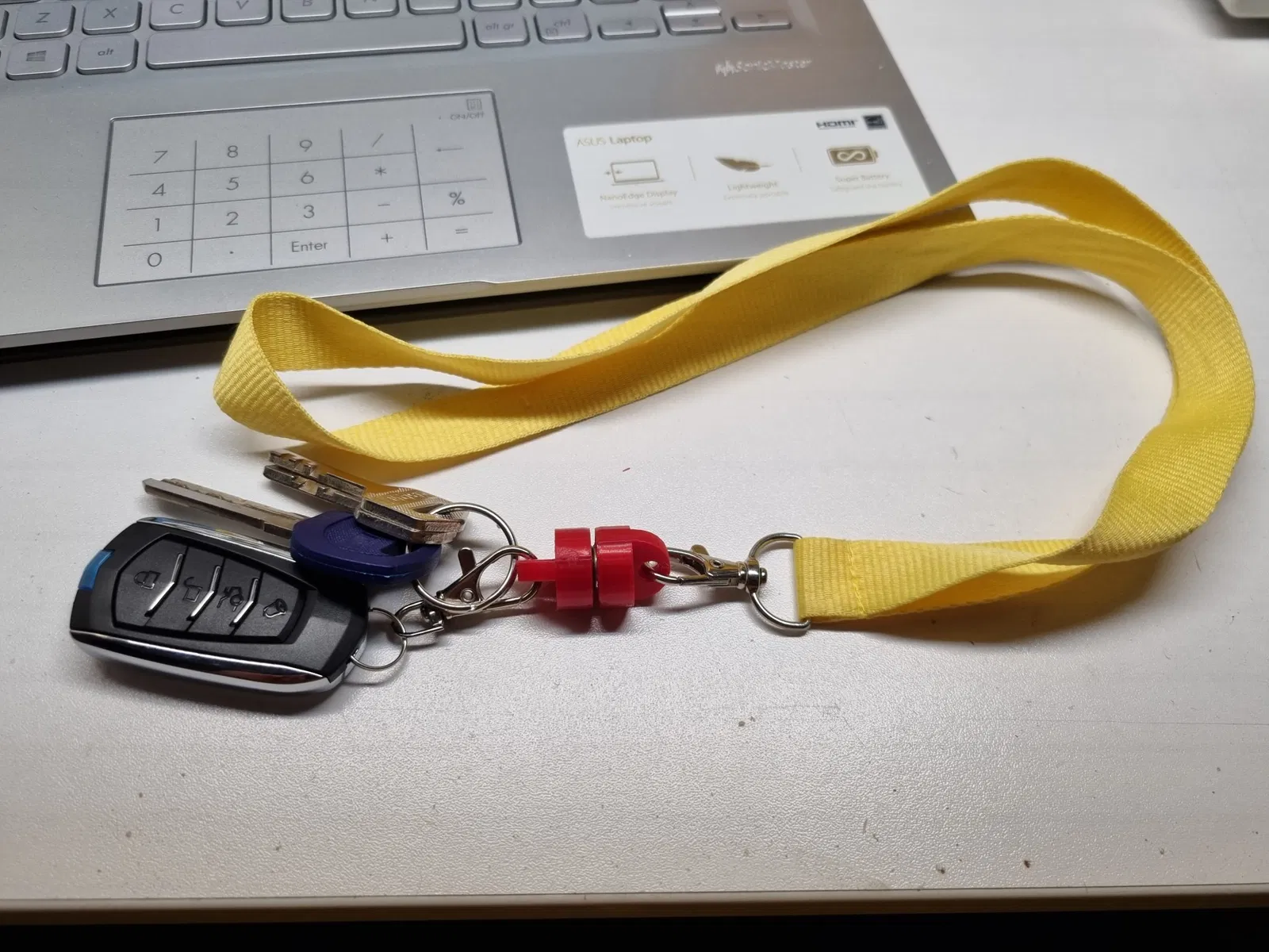 Để có giải pháp an toàn nhất, hãy in 2 nửa, gắn một nam châm vào mỗi nửa và bạn thậm chí có thể chạy với chìa khóa nặng quanh cổ mà chúng sẽ không rơi.