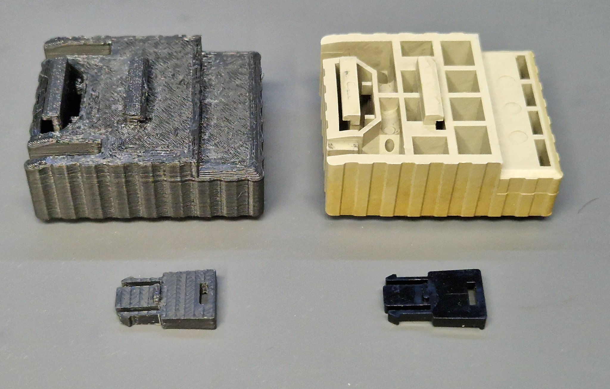 Chân cần được in với các móc cố định hướng xuống và với các hỗ trợ như được hiển thị trong hình. Chiều cao lớp 0.2mm, vòi phun 0.4mm và được in từ PETG. Chốt khóa được in với chiều cao 0.12mm và đã được chỉnh sửa để in mà không cần hỗ trợ. Chốt đã chỉnh sửa có thể được sử dụng với chân gốc.