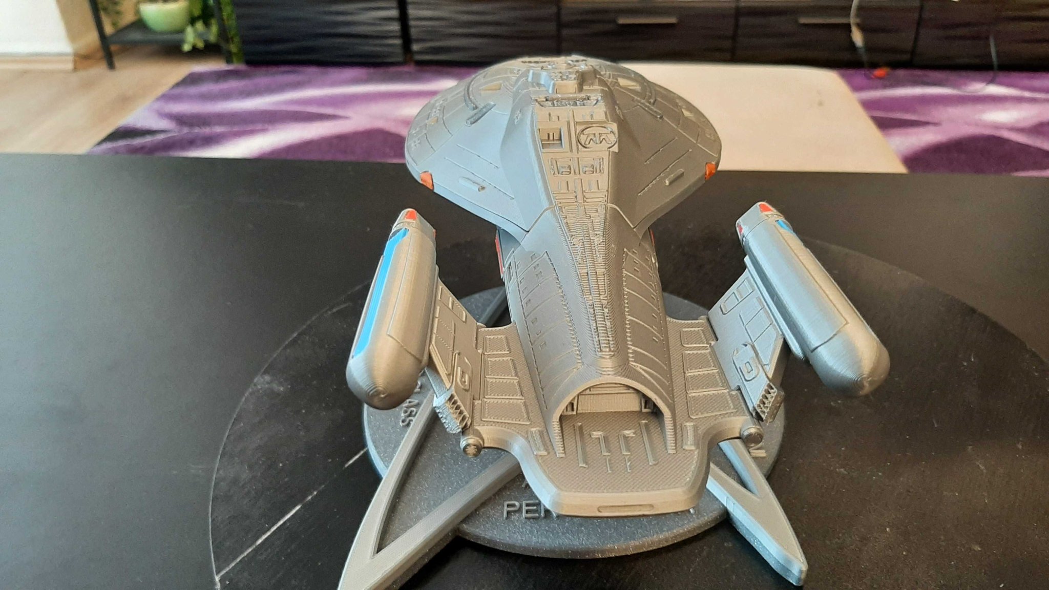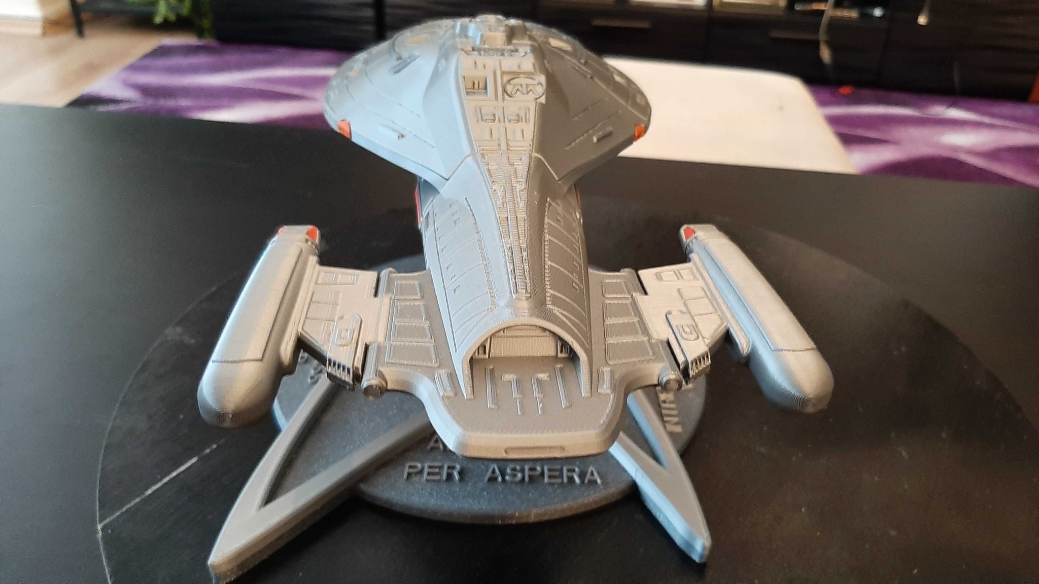 Đây là mô hình in 3D của lớp Intrepid NCC-74656 Voyager từ Star Trek. Mô hình có các cột hình học biến đổi nên có thể được trưng bày với các cột hạ xuống hoặc nâng lên như trong trạng thái tăng tốc. Đây là một bộ lắp ráp nên không cần keo. Các phần có màu khác nhau được tách rời để dễ in hơn. Các mảnh của các necelles và một số chi tiết cần được tách thành các mô hình riêng biệt trong phần mềm cắt ;)