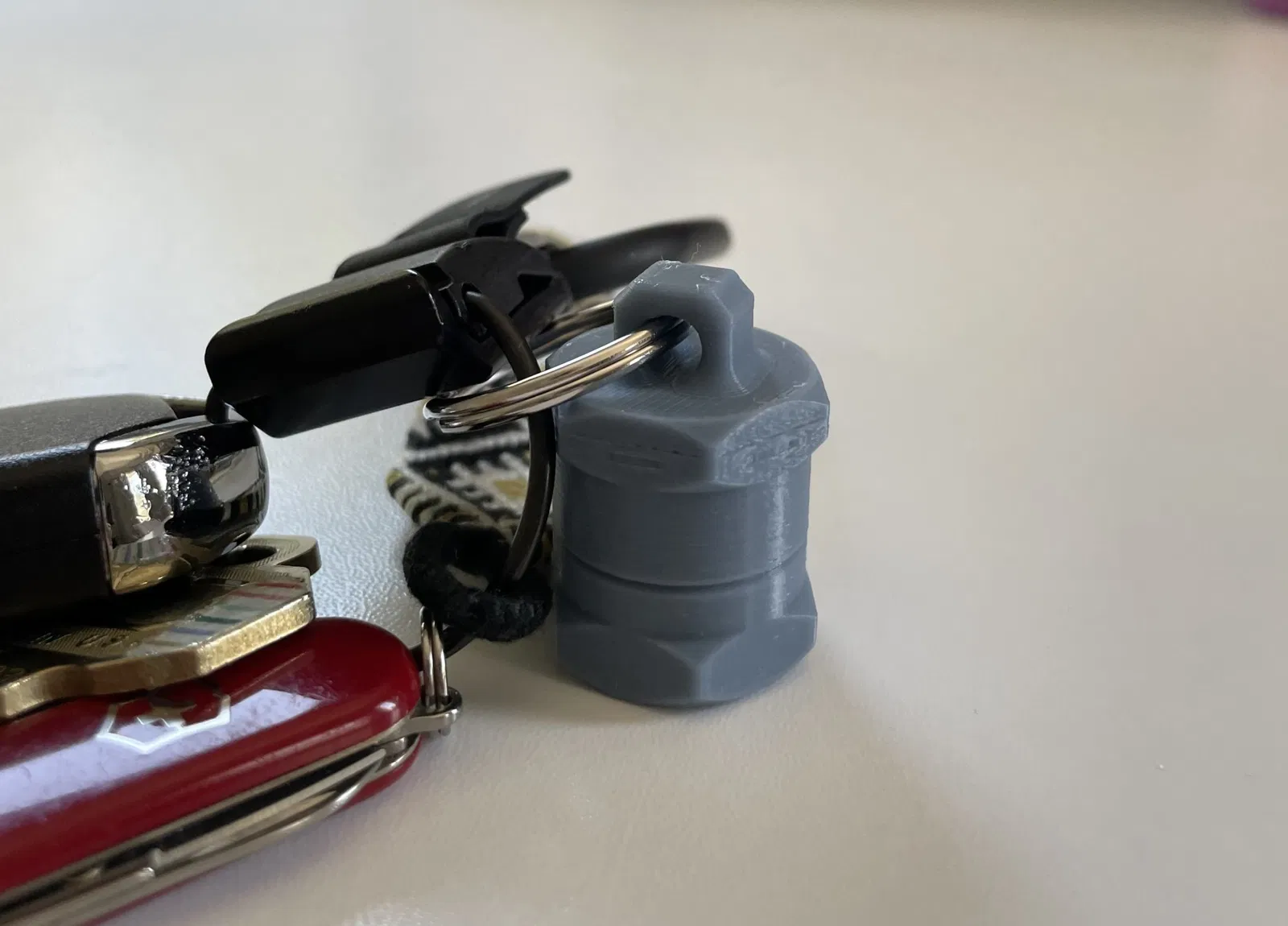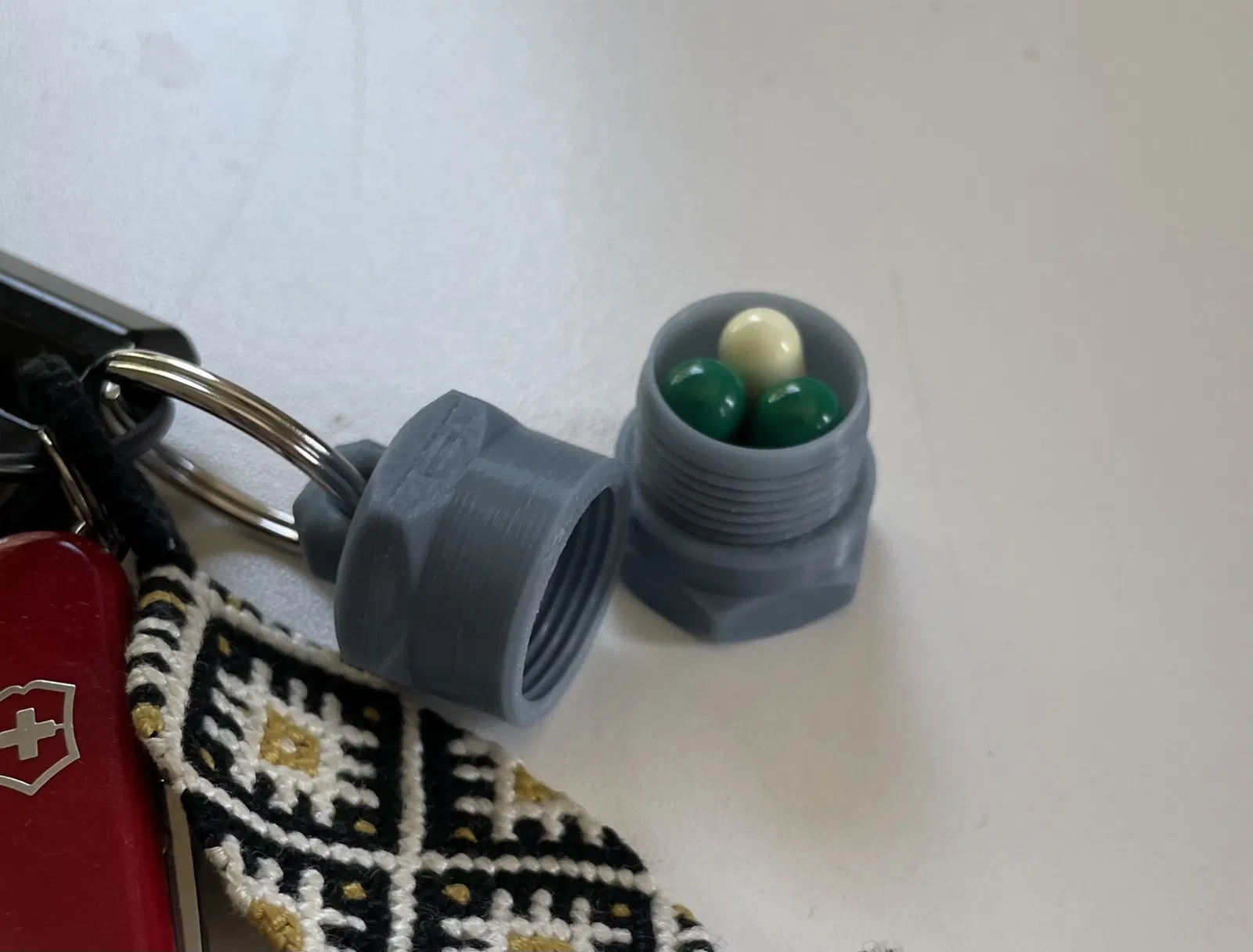 Một thùng chứa vít tùy chỉnh hoàn toàn/tham số với một vòng lặp để gắn vào dây buộc, ba lô hoặc móc khóa