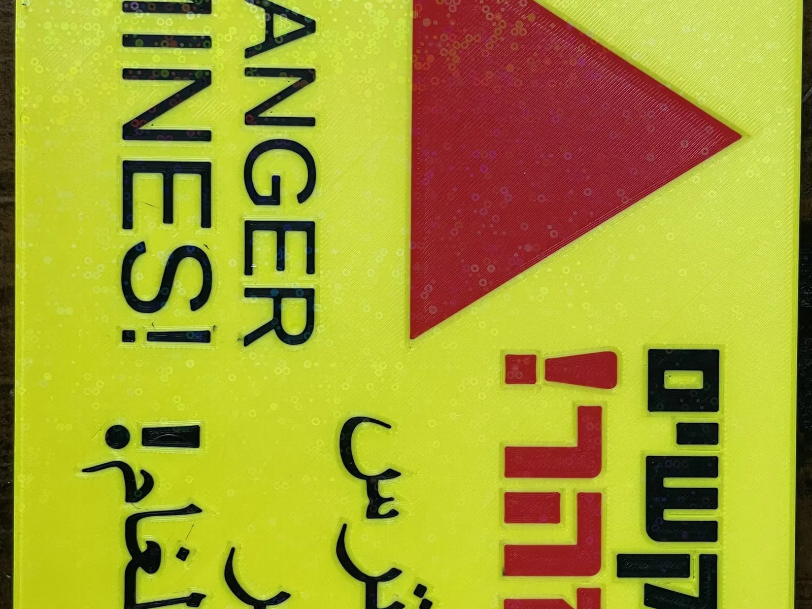 Một biển báo cảnh báo về mìn bằng tiếng Anh, Hebrew và Ả Rập. Biển báo trong bức ảnh được in bằng 3 màu trên một Bambulab X1C đặt úp trên một tấm PEY. Mìn ở phía sau là từ Triple G Workshop:
