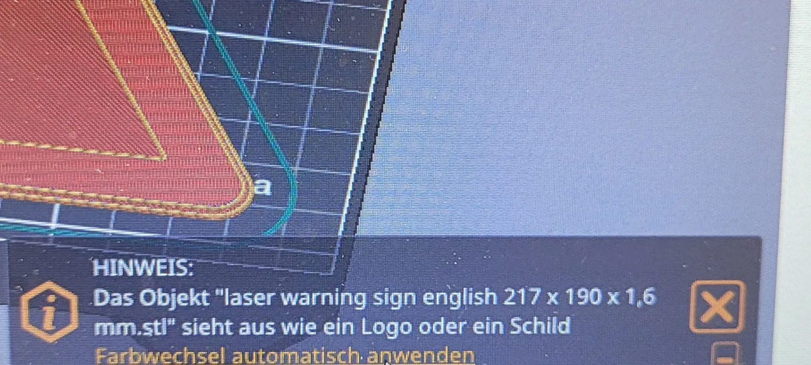 Cảm ơn Maeshmaker vì thiết kế tuyệt vời của biển báo laser! https://www.f3d.vn/3d-model/44891-bieu-tuong-canh-bao-laser-theo-tieu-chuan-din-4844-2-iso-7010 Vì tôi đang thử nghiệm laser trên Snapmaker, tôi muốn một biển báo như thế này cho cửa xưởng của mình. Tôi đã dán một nam châm vào mặt sau của biển báo để gắn nó vào cánh cửa kim loại này. Tôi chỉ đang tải lên hai ví dụ về việc tùy chỉnh biển báo ở đây dưới dạng remix. Để làm điều này, tôi đã tải file 1mm base stl từ Maeshmaker vào eSlicer Và điều chỉnh nó ở đó: Bằng cách phóng to theo x và y (Mở khóa tỷ lệ!) Và thêm văn bản (cao 0.6mm/có dấu) hai file ví dụ của tôi nên Phù hợp với MK3 và MK4 như chúng đang có. Tất nhiên, bạn cũng có thể phóng to hoặc thu nhỏ chúng theo ý muốn của mình. Tôi đã sử dụng chức năng thay đổi màu tự động được Prusaslicer cung cấp cho việc thay đổi filament/màu sắc. (M600 sau chiều cao lớp 1mm). ------------ Cảm ơn Maeshmaker vì thiết kế tuyệt vời của biển báo laser. https://www.f3d.vn/3d-model/44891-bieu-tuong-canh-bao-laser-theo-tieu-chuan-din-4844-2-iso-7010 Vì tôi đang thử nghiệm laser trên Snapmaker, tôi muốn một biển báo như thế này cho cửa xưởng của mình. Tôi đã dán một nam châm vào mặt sau của biển báo để gắn nó vào cánh cửa kim loại này. Tôi chỉ đang tải lên hai ví dụ về việc tùy chỉnh biển báo ở đây dưới dạng remix. Tôi đã tải file 1mm base stl từ Maeshmaker vào eSlicer Và điều chỉnh nó ở đó: Bằng cách phóng to theo x và y (Mở khóa tỷ lệ!) Và thêm văn bản (cao 0.6mm/có dấu) hai file ví dụ của tôi nên phù hợp với MK3 và MK4 như chúng đang có. Bạn có thể phóng to hoặc thu nhỏ chúng theo mong muốn của mình. Tôi đã thêm chức năng thay đổi màu tự động được Prusaslicer cung cấp cho việc thay đổi filament/màu sắc. (M600 sau chiều cao lớp 1mm).