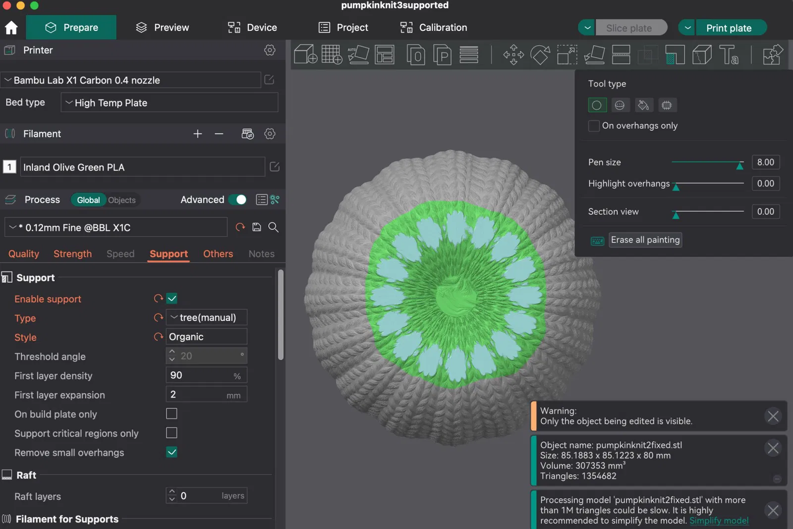 Thiết kế đầu tiên này được in bằng Polymaker PLA màu xanh mờ với các cài đặt đã được điều chỉnh cho X1C của tôi. Tôi rất khuyên bạn nên thực hiện hiệu chỉnh riêng cho chất liệu bạn mong muốn. Phần lấp đầy được thực hiện ở mức 15% để giúp giảm thời gian in vì đây là một món đồ trang trí, nhưng bất kỳ phần lấp đầy nào theo sở thích của bạn khoảng 10-15% cũng sẽ đủ. Tôi đã in với độ cao lớp 0.12 mm và đầu phun 0.4 mm với các hỗ trợ hữu cơ sơn ở dưới cùng.