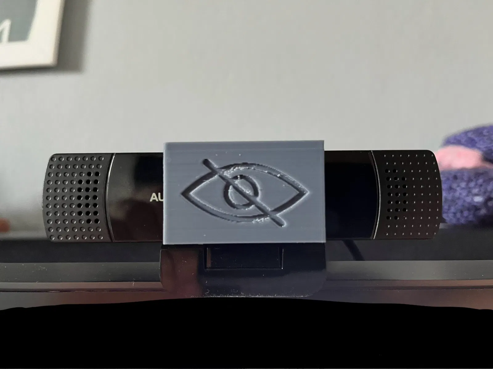 Đã tạo một bìa đơn giản cho Webcam Aukey. Chỉ cần trượt qua ống kính. In ra mà không cần giá đỡ.