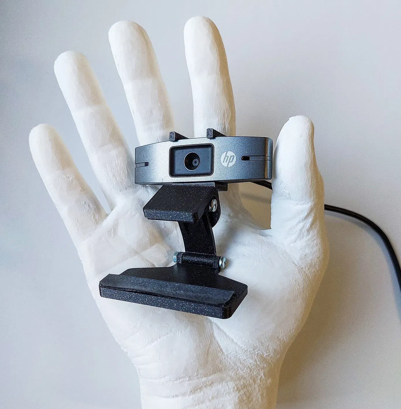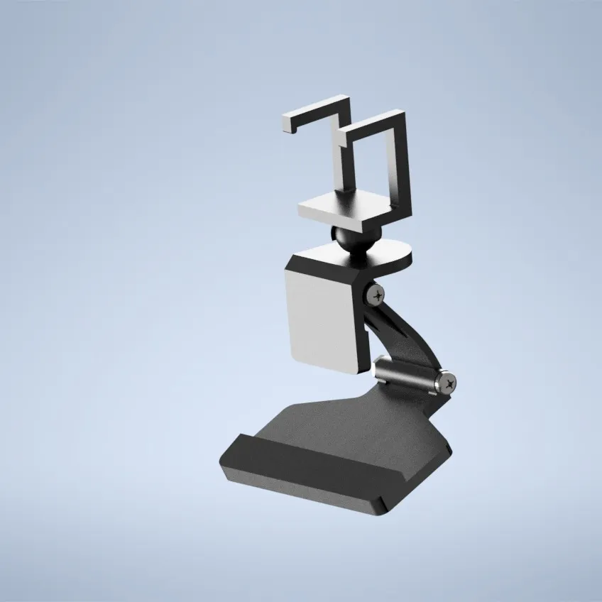 Klip se skládá z 5 dílů, samotná kamera je zasazena do rámu, který se na kulovém kloubu může natáčet do potřebné polohy. Kulový čep je složen ze dvou shodných polovin slepených vteřinovým lepidlem (z důvodu snadného tisku), pánev je součástí rámu pro kameru. Čep je vsazen do otvoru v podložce. Spoje tří nosných dílů jsou provedeny šrouby M 3 s maticemi, spoje jsou dotaženy s mírným předpětím a matice jsou pojištěny kapkou lepidla proti uvolnění. Třecí plochy opory a podložky jsou na vystupujícím povrchu opatřeny nalepenou pryží (z duše do jízdního kola).