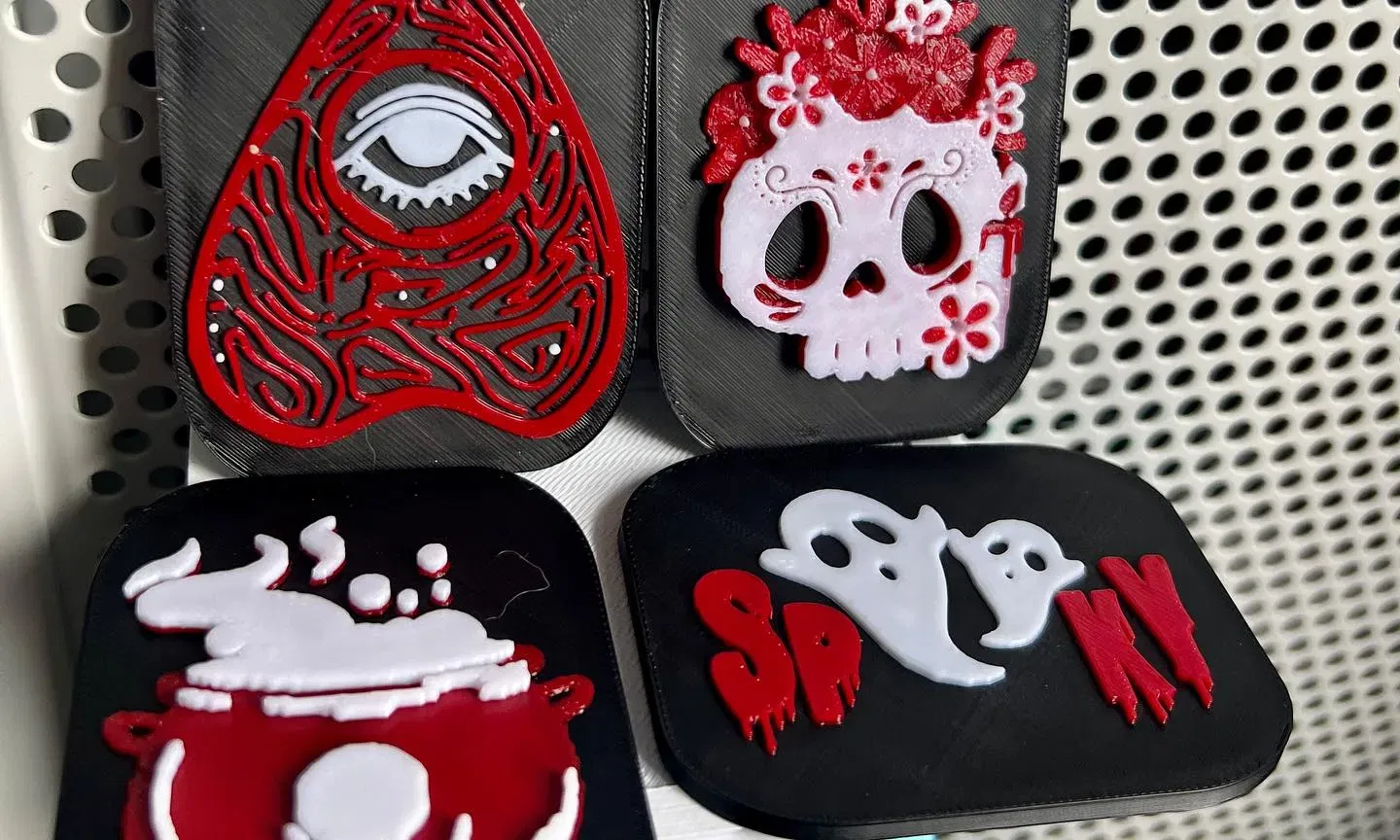 Chỉ là một số thiết kế rùng rợn, tôi đã đặt chúng lên nam châm, nhưng tôi cũng đã làm biển báo và móc khóa từ chúng, bao gồm cả các thiết kế và tấm nền tôi đã sử dụng để đặt chúng lên nam châm và móc khóa!
