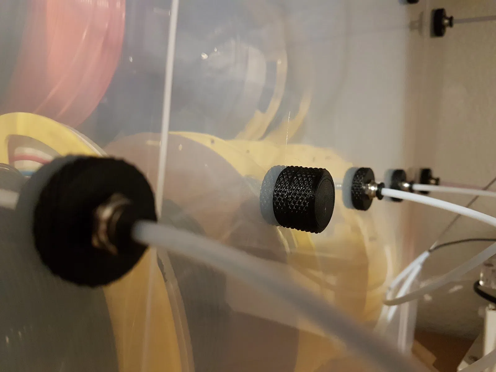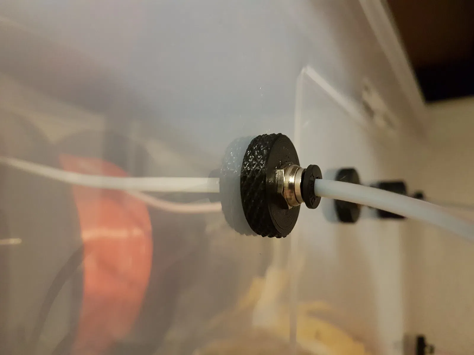 Trong thiết lập hộp khô của tôi, tôi đã sử dụng các bộ nối PC4-M6 cho phép ống PTFE có đường kính ngoài 4mm đi thẳng qua để đưa đầu ống PTFE ngay sát cuộn filament.