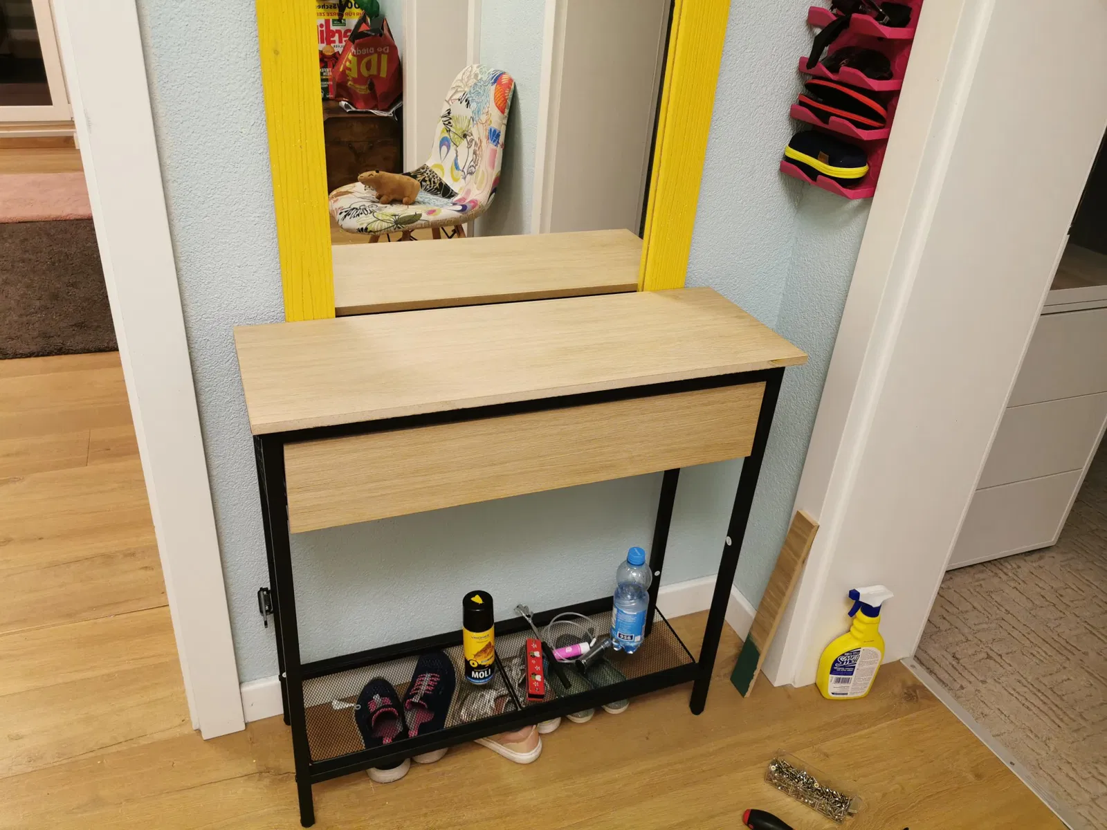 Tôi cần một bàn console không quá sâu cho hành lang. Thật không may, tôi không thể tìm thấy nhiều loại đồ nội thất như vậy trên thị trường, và ngay cả khi có, chúng cũng không phù hợp với trang trí. Và nếu vẻ ngoài phù hợp - thì hiếm khi đồ nội thất đủ "sâu" - tôi chỉ có thể đặt nó cách tường 25 cm để không va vào khi đi lại. Và nếu nó nông, thì lại quá rộng (tôi chỉ có chỗ cho 95 cm)... Cuối cùng - tôi đã tìm thấy - thương hiệu Hoobro trên Amazon, có những chiếc bàn hoàn hảo. Có nhiều phiên bản của kệ dưới, nhưng khung thì giống nhau. Nếu không phải vì chúng không có ngăn kéo. Ngăn kéo rất hữu ích. Vì vậy, tôi đã thiết kế giá treo ngăn kéo cho chúng, và ngăn kéo tự nó. Hoobro B09NLJ28L1 EBF75XG01 EBF74XG01