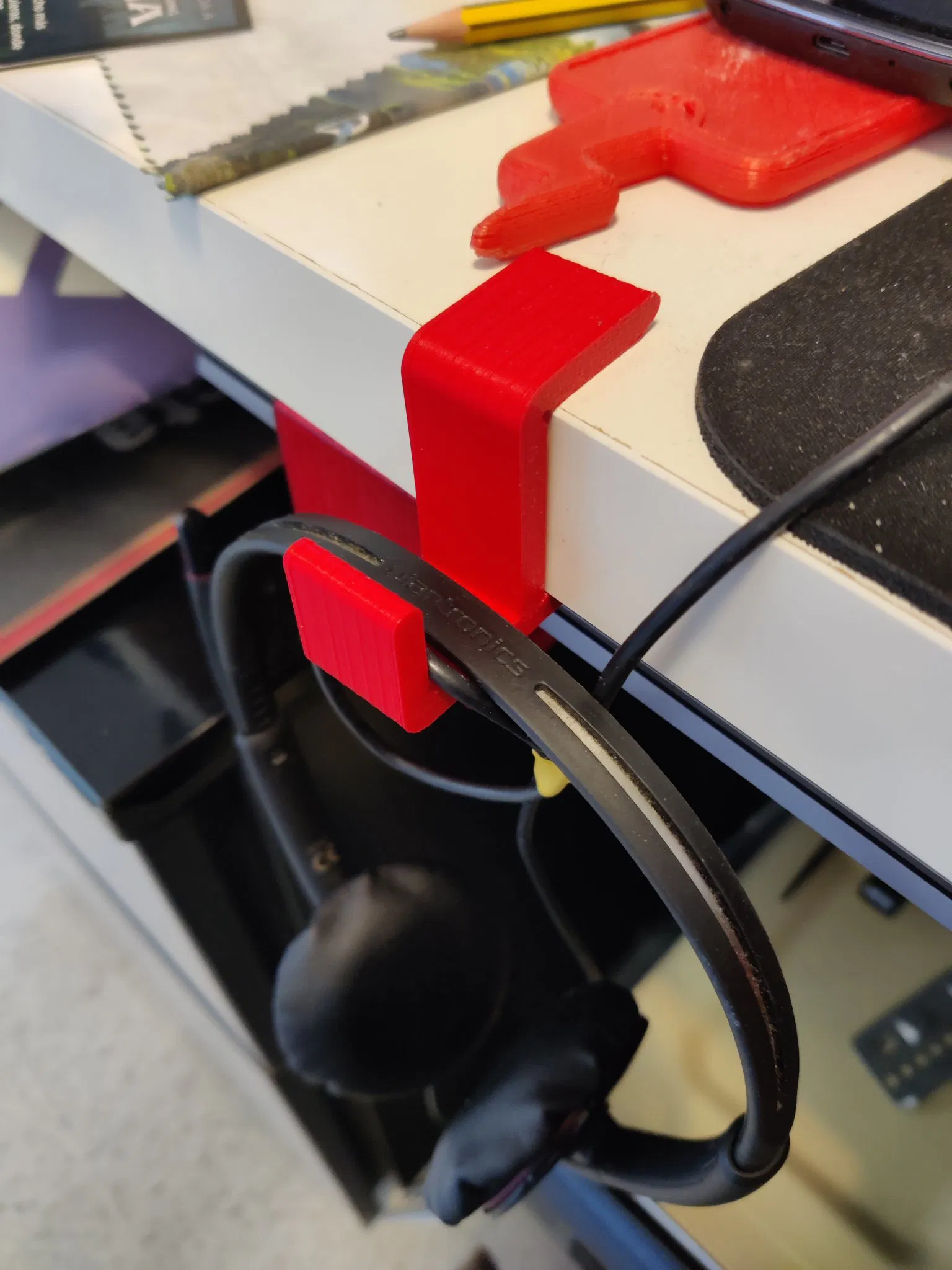 Đây là một giá đỡ tai nghe đơn giản nhưng hiệu quả. Nó có thể dễ dàng thích ứng với bất kỳ độ dày bàn nào. Hãy đo nó và loại bỏ 0.1mm để có độ bám tốt hơn. Các khe ở các góc bên trong sẽ giúp cố định tốt hơn trên bàn.
