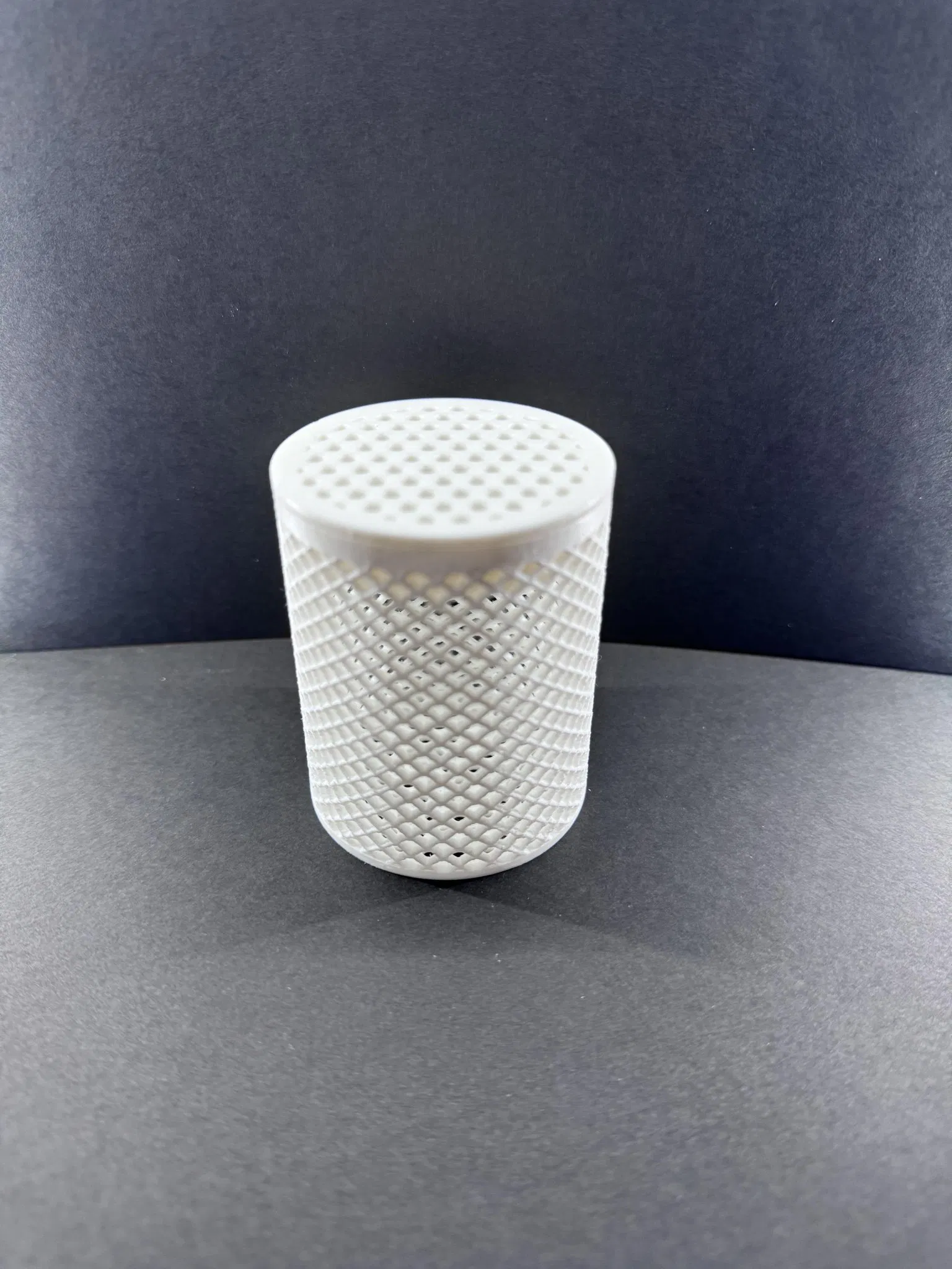 Nắp trượt vào bên trong rổ và tạo ra một khớp chặt đẹp. Một chút chà nhám trên nắp và bên trong rổ tạo ra một khớp chặt rất mượt mà. Kích thước tổng thể là 66mm (C) x 54mm (Đ). Thể tích bên trong khoảng 120mL (35-40g viên gel silica).