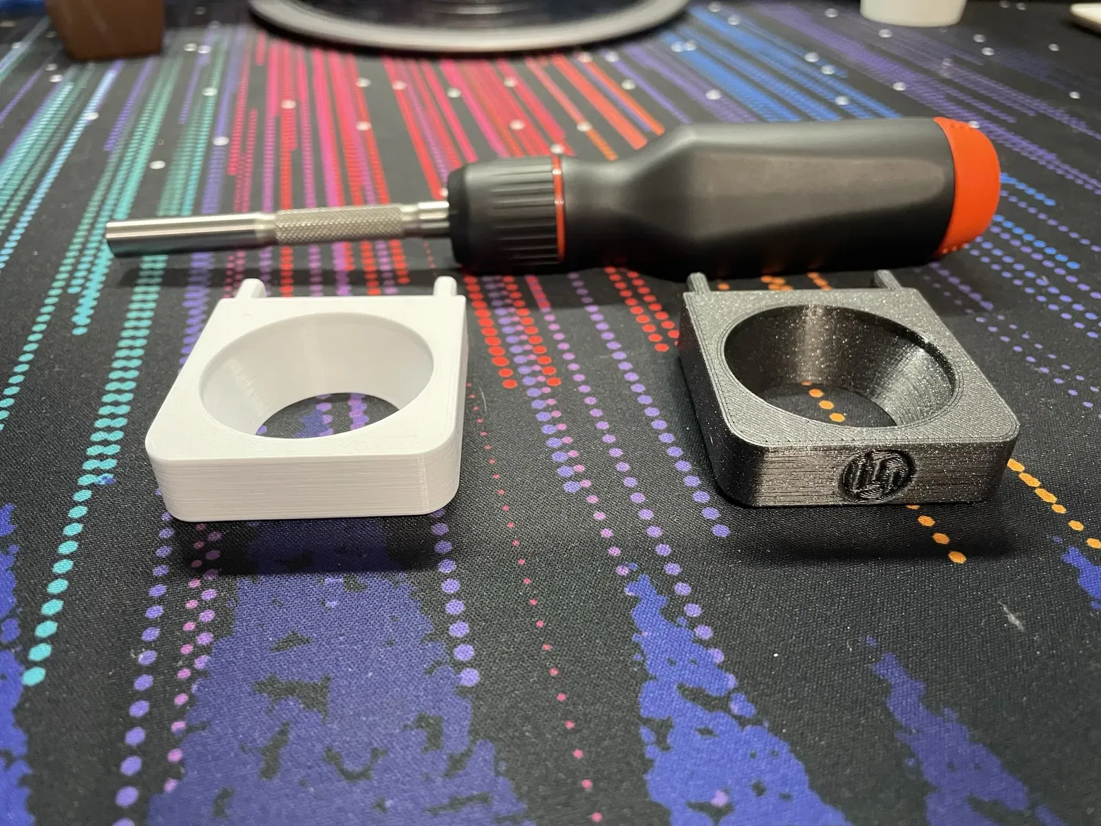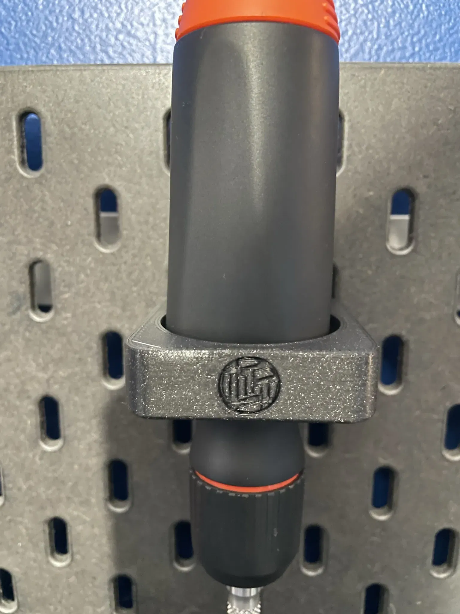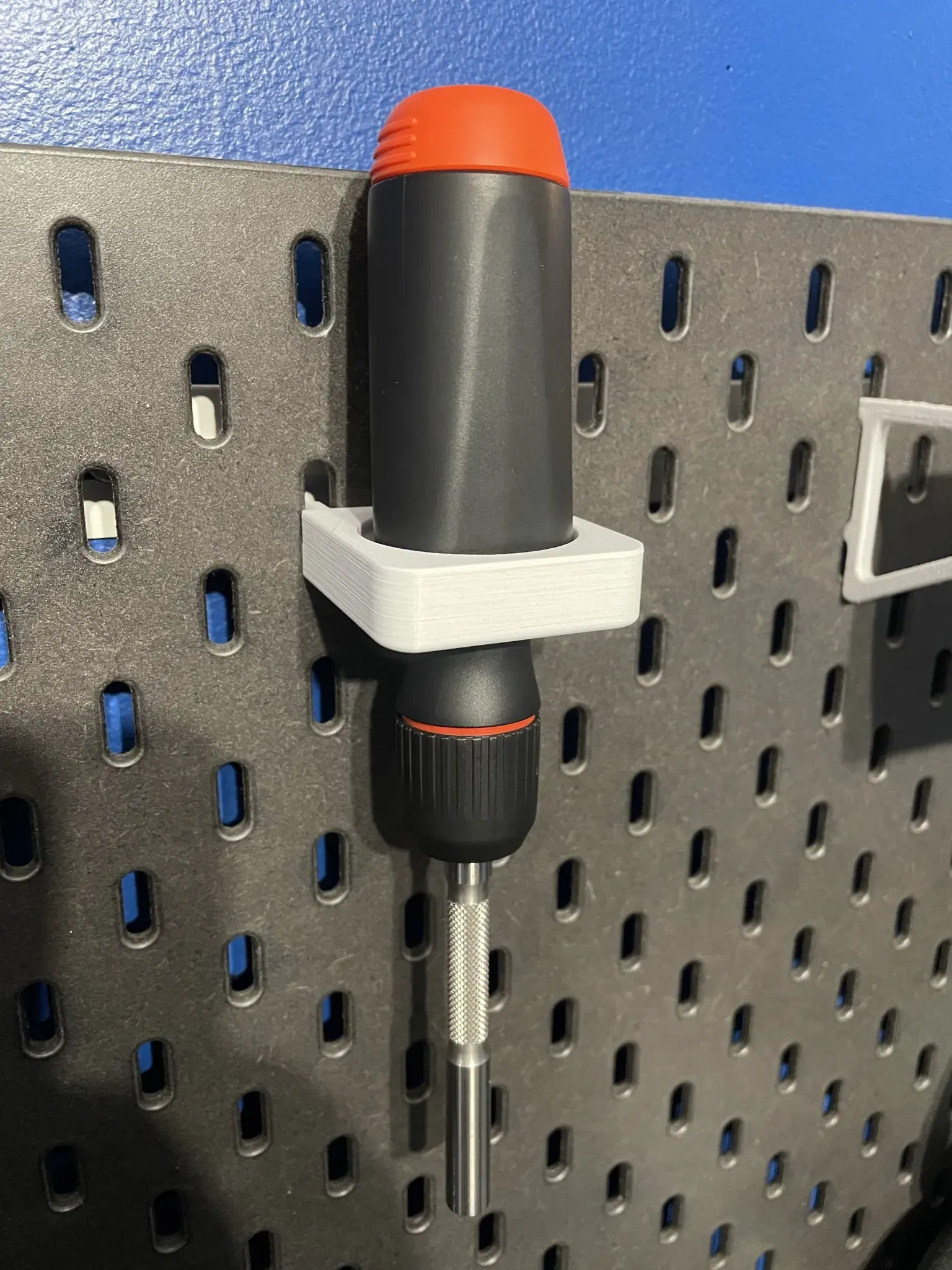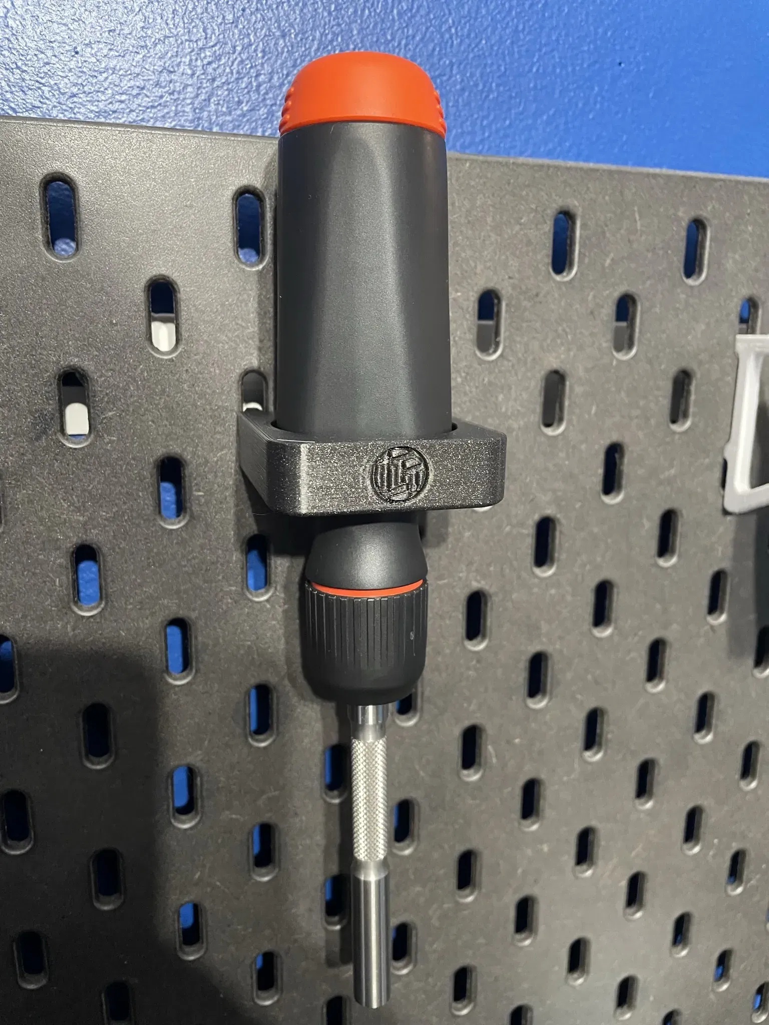 Tôi cần một cách để treo cái tua vít LTT mới của mình trên bảng ghim Skadis mà tôi có trong văn phòng. Cái này chỉ giữ nó theo chiều dọc và nó vừa vặn trong một lỗ nghiêng giúp giữ nó thẳng đứng và ngăn không cho nó đổ.