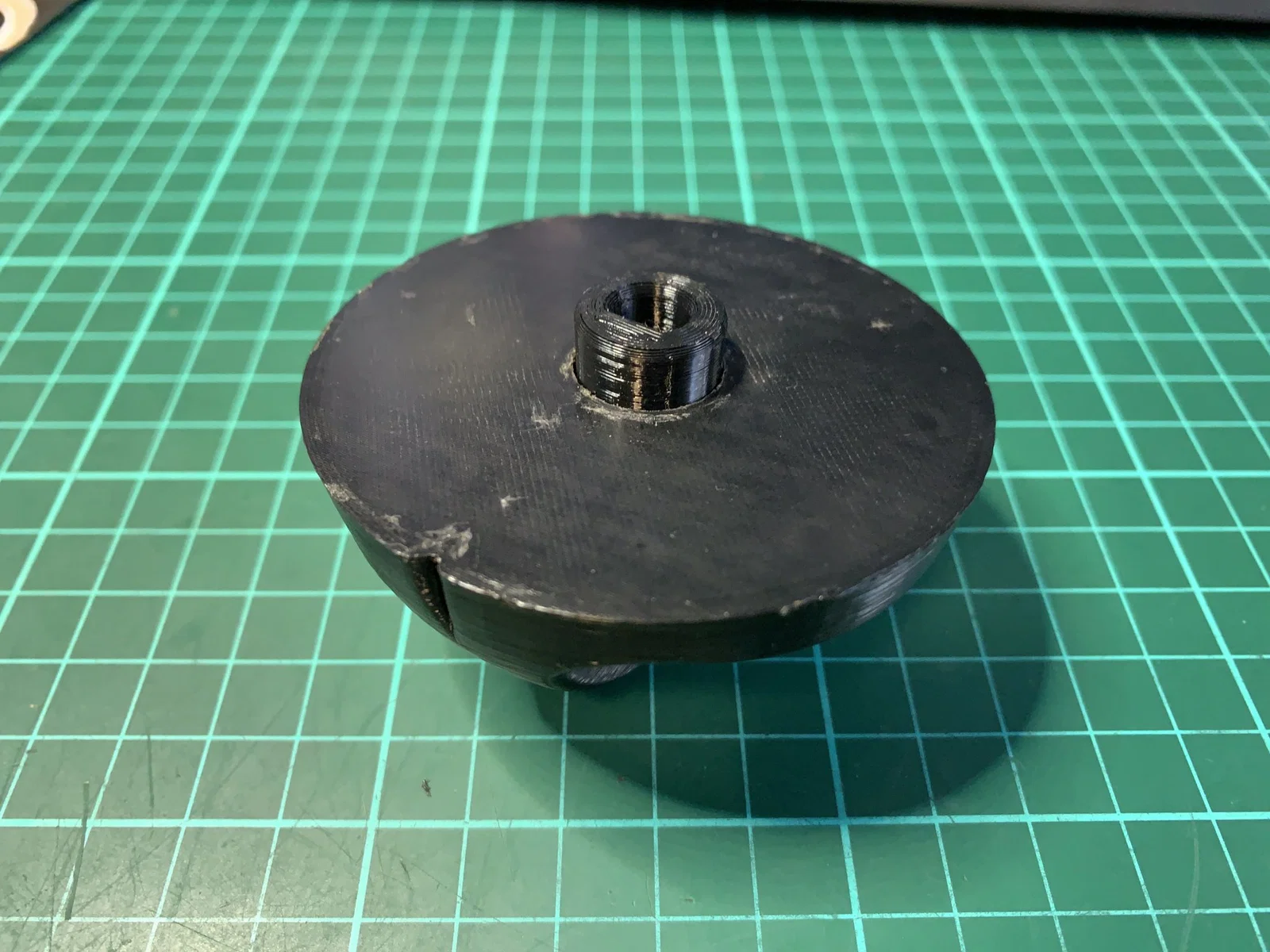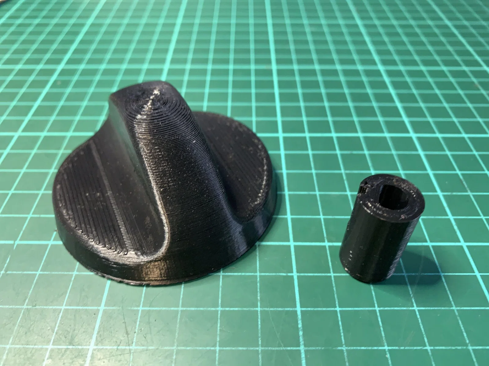 Thiết kế của tôi bao gồm hai phần, núm bên ngoài và bộ lắp trục. Hai phần này được lắp vừa vào nhau, mặc dù việc thêm một loại keo phù hợp sẽ đảm bảo các phần không bị tách rời.