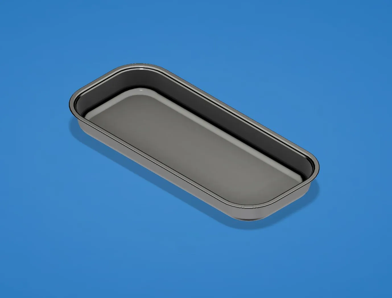 Đây là một thiết kế 3D của một khay hình chữ nhật bằng thép không gỉ có sẵn qua eBay và AliExpress (với các nam châm đã được loại bỏ). Kích thước của khay là 136.5mm x 54mm ở đáy và cao 13.5mm với các cạnh thuôn. Khay có một vành làm cho kích thước bên ngoài là 146.25 x 64.25mm.