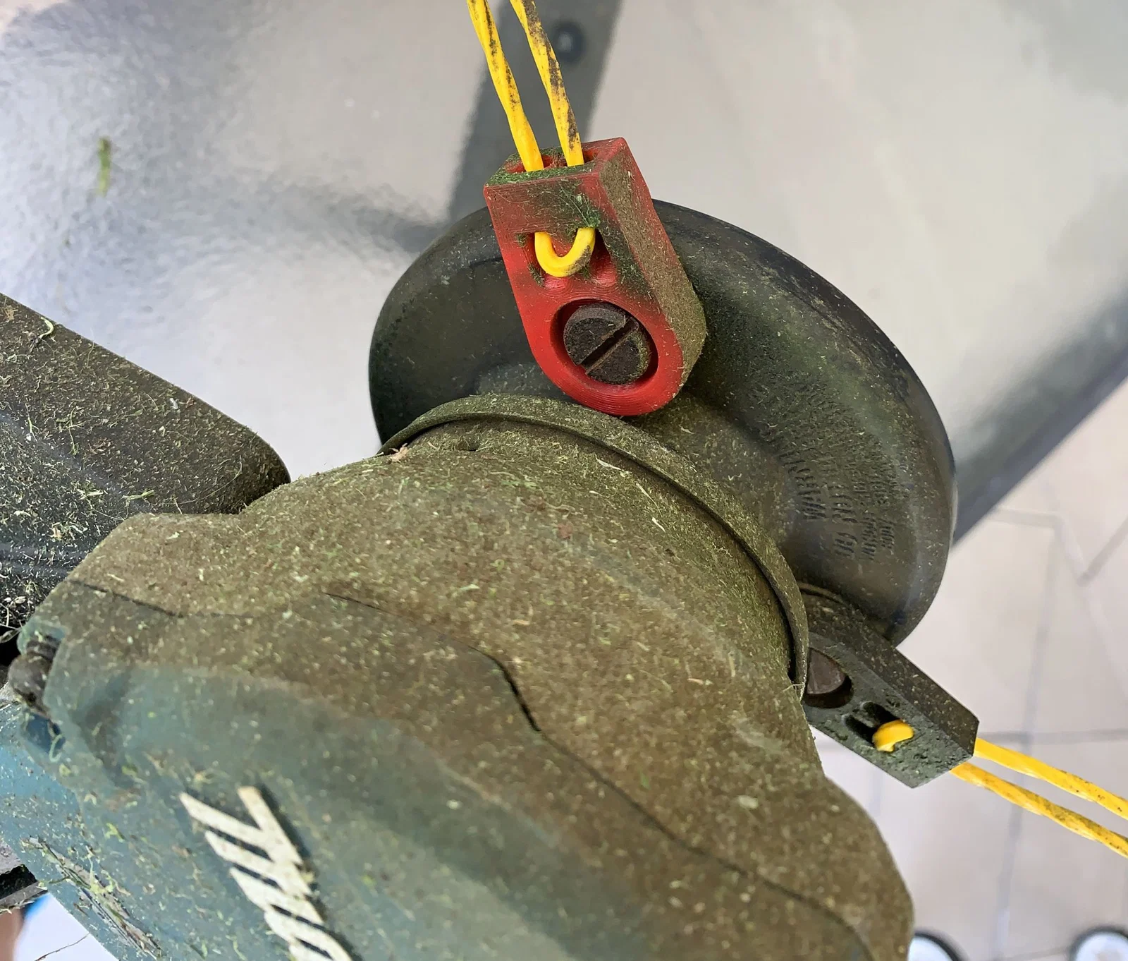Sau 2 năm, một trong những giá đỡ sợi cước trên đầu của bên thứ ba đã bị gãy. Phần gãy này không có sẵn như một linh kiện thay thế, vì vậy tôi chỉ có thể mua một đầu mới hoàn toàn hoặc in 3D một giá đỡ mới. Đây là phần thay thế 3D của tôi.