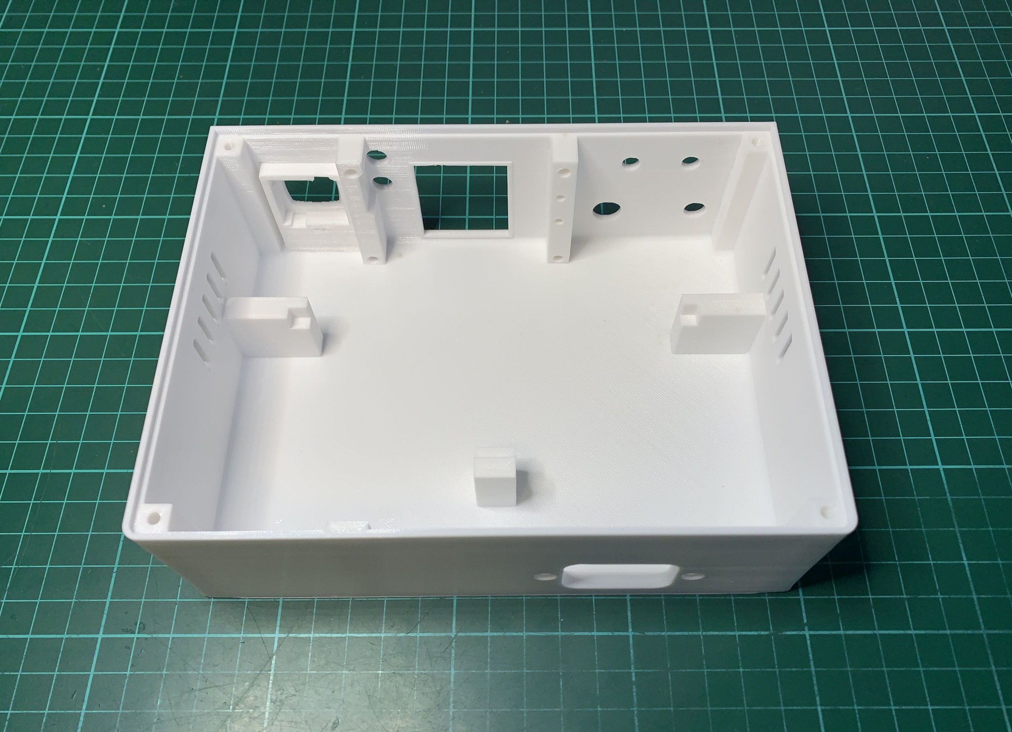 Đây là vỏ giải pháp in 3D của tôi cho nguồn cấp điện. Phần trên của vỏ giữ tất cả các thành phần bên trong vào vị trí. Cũng có một bảng điều khiển trước in 3D riêng biệt với văn bản in để tạo ra một hoàn thiện sạch sẽ. Nắp vỏ được giữ cố định bởi bốn vít 3.5x15mm từ bên dưới.