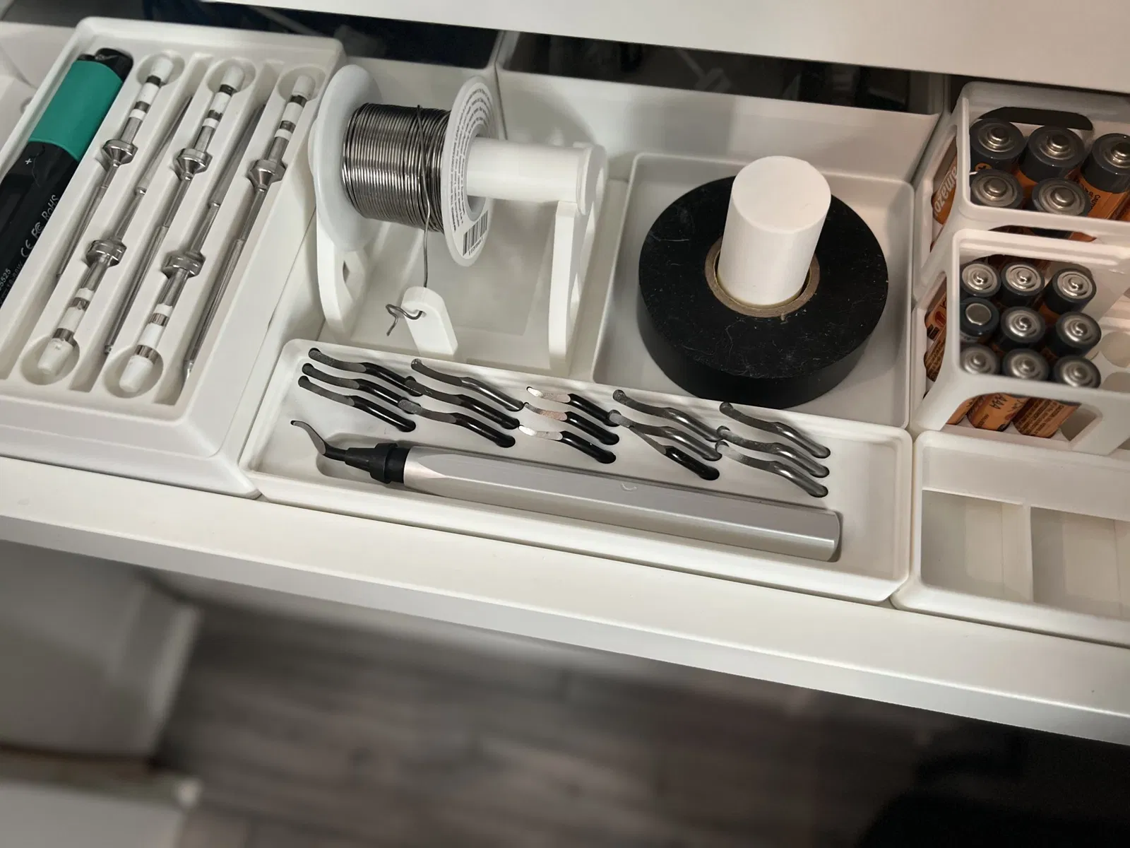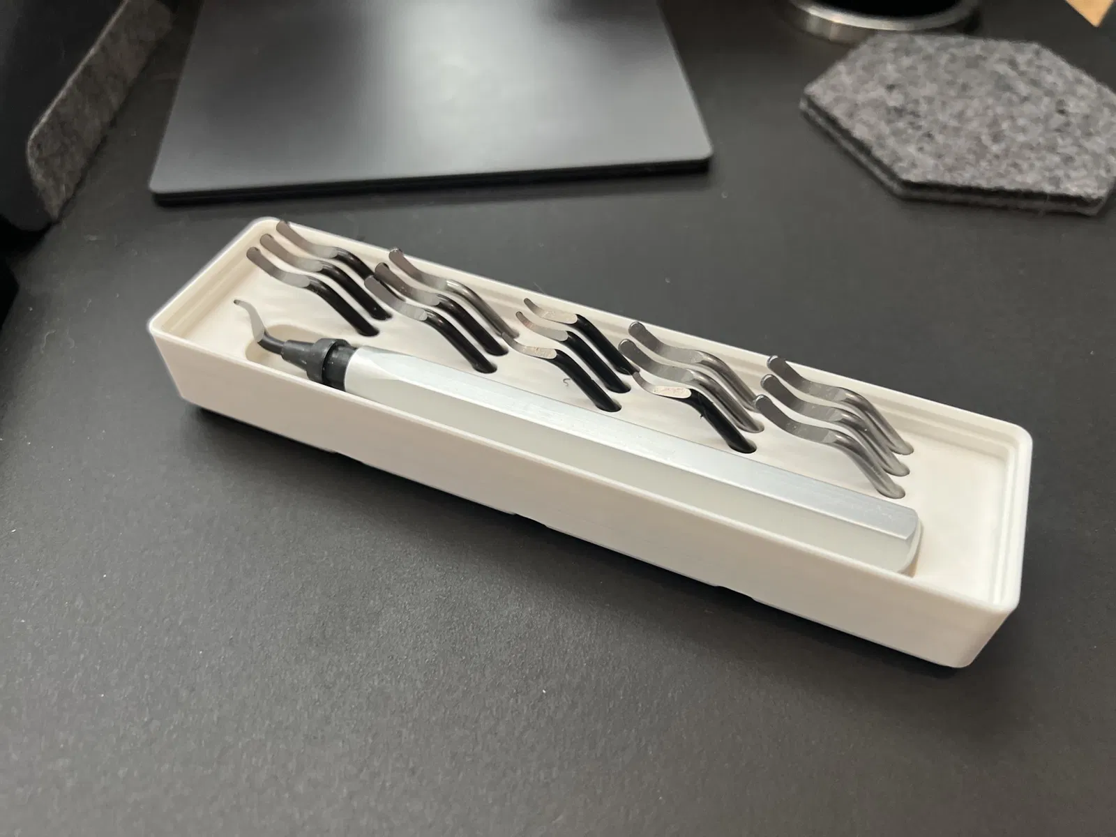 Một khay dụng cụ loại bỏ bavia giữ dụng cụ và 15 đầu thay thế. Đây là một phiên bản remix của khay giữ dụng cụ loại bỏ bavia Gridfinity của darious, được chỉnh sửa để giữ 15 đầu thay thế.