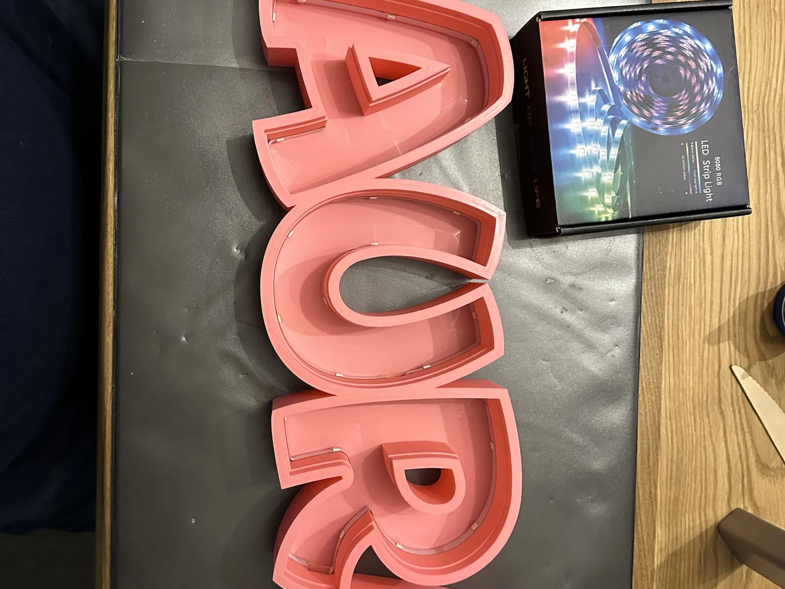 Laura như một đèn tên LED có thể in. In từng chữ cái riêng lẻ, để dán cùng với cáp tổng thể