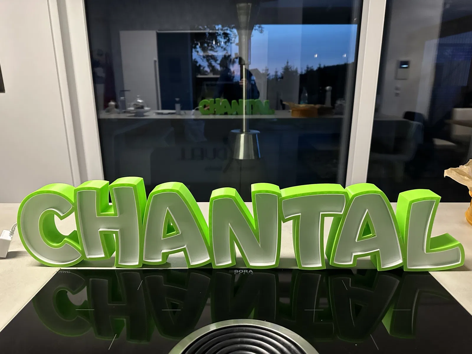 Chantal như một đèn tên LED có thể in. In từng chữ cái riêng lẻ, để dán cùng với cáp tổng thể